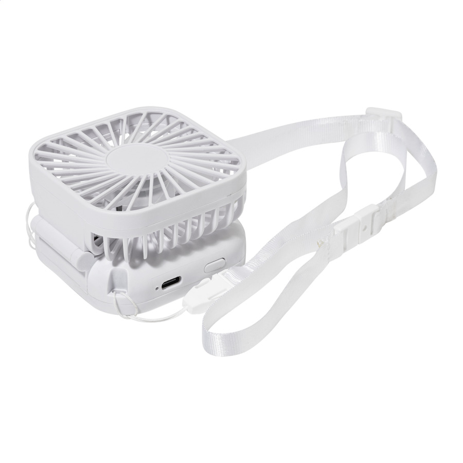 Elektrický ručný vetráčik z recyklovaného ABS plastu s pútkom na krk a vstavanou dobíjacou batériou cez USB (500 mAh). S nastaviteľným uhlom hlavy a 3 rýchlosťami. Vrátane USB kábla na nabíjanie.