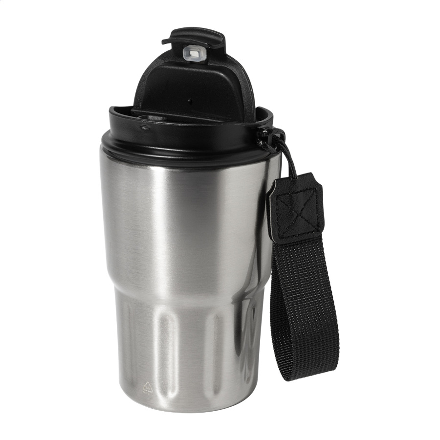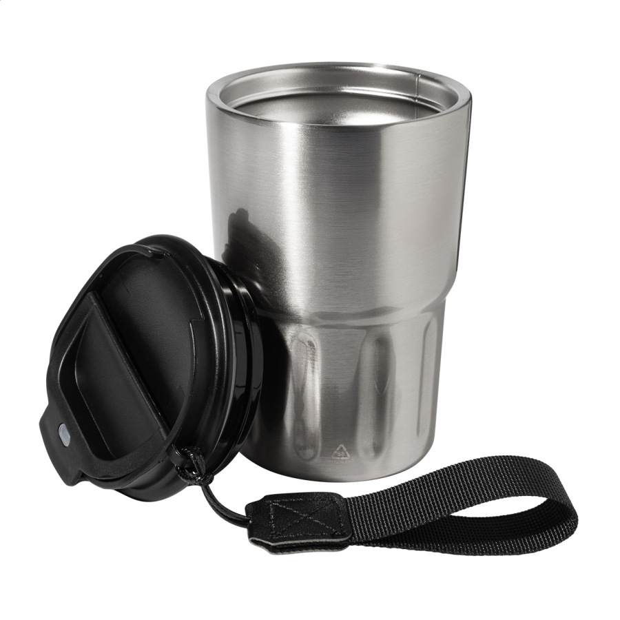 Dvojstenný termo hrnček z recyklovanej nerezovej ocele s izolačným viečkom z PP. S pútkom z RPET polyesteru. 350 ml.