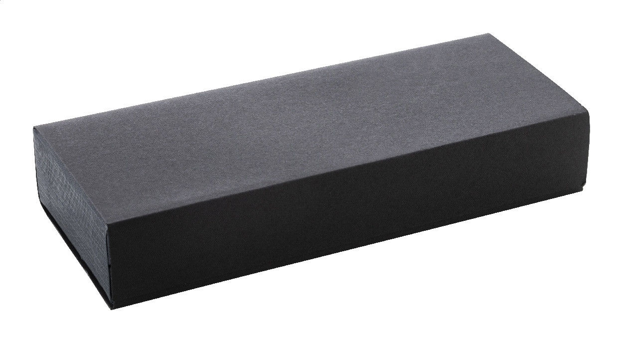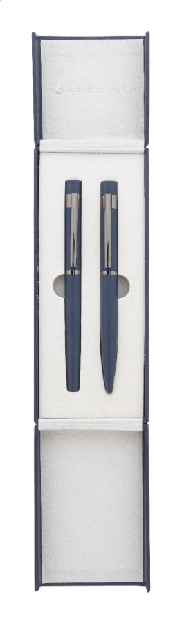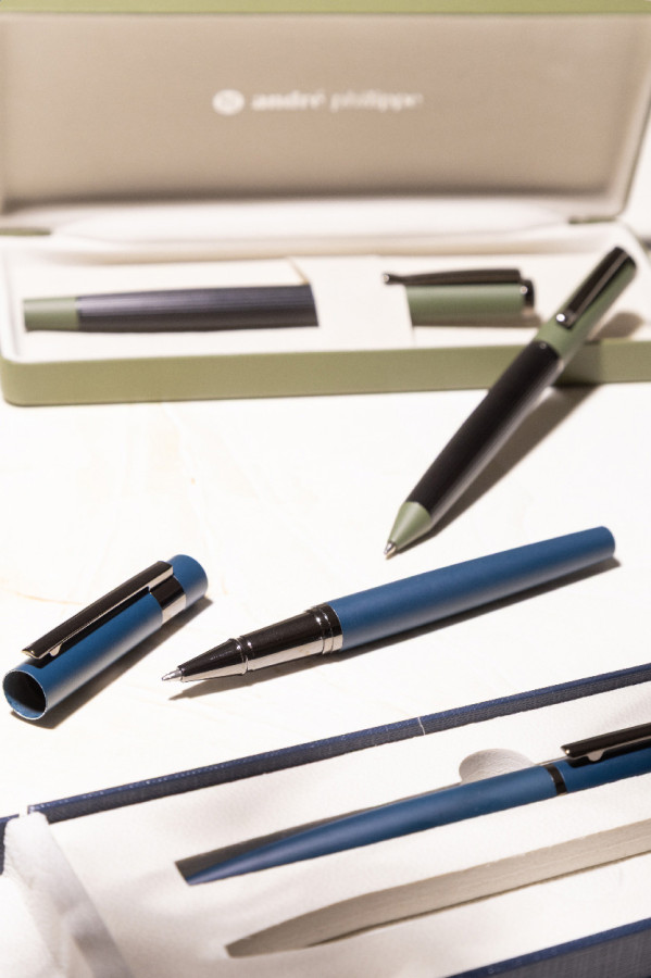 Elegantná sada kovového guľôčkového pera a rollera s lesklými detailmi vo farbe antracit. Vo farebne zladenej darčekovej krabičke a s modrou náplňou. Produkt značky André Philippe.