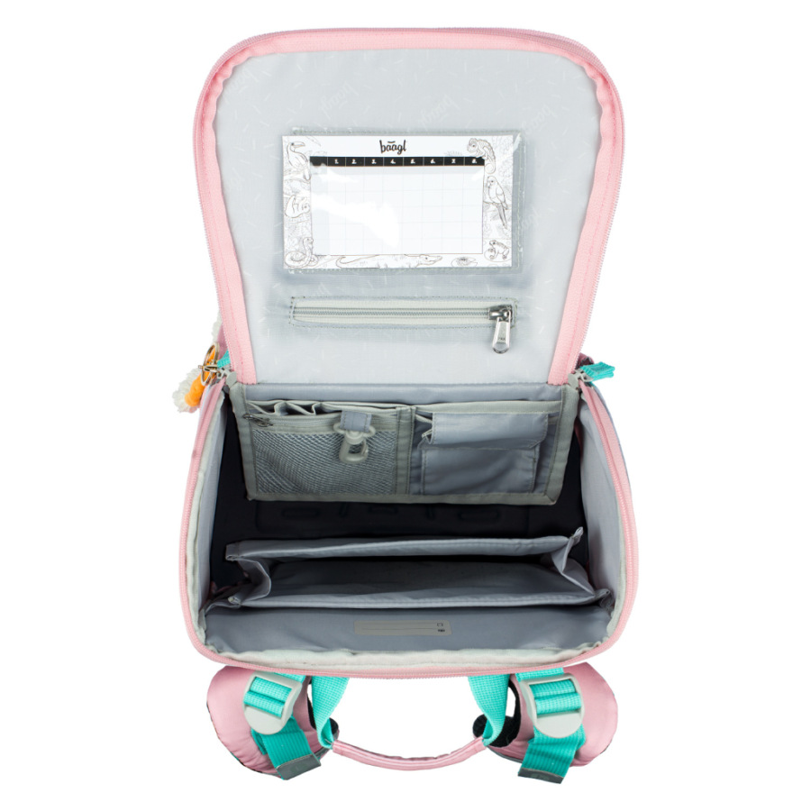 • Vo vnútri aktovky je priehľadná kapsička na rozvrh a vnútorný organizér umožňujúci rovnomerné rozloženie hmotnosti, doplnený gumičkou na fixáciu.