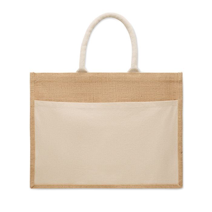 Nákupní taška z laminované juty a bavlněného 280 g plátna. Provazová ucha. Velkoá otevřená přední kapsa.