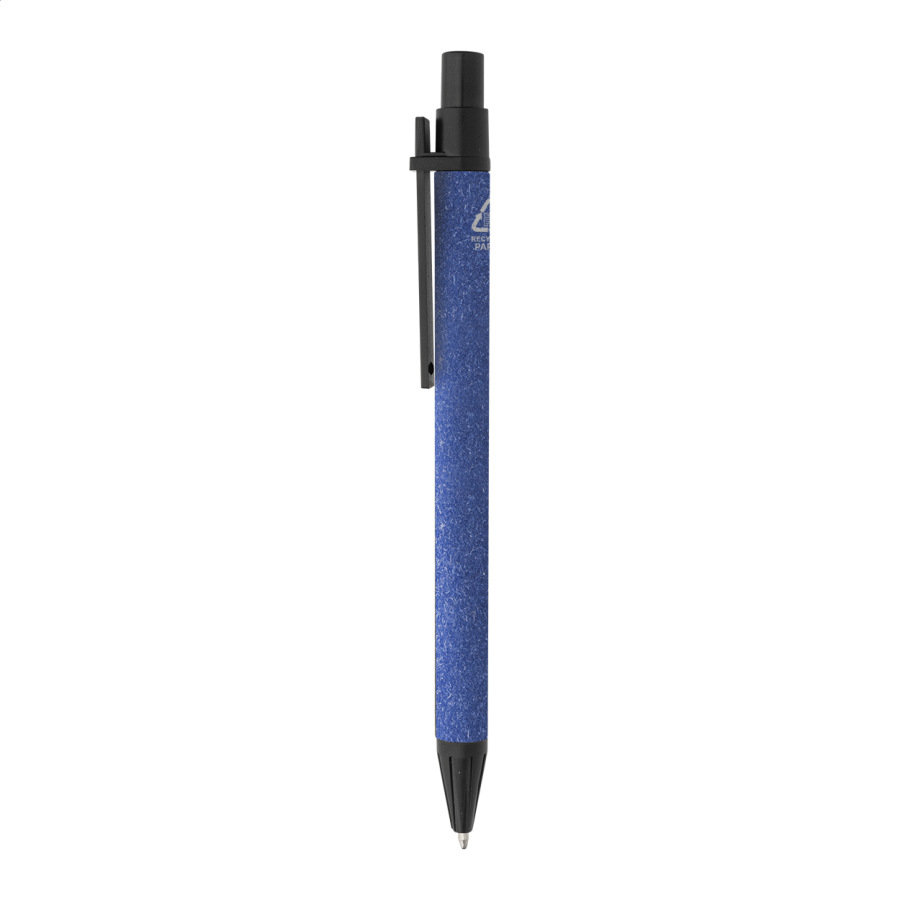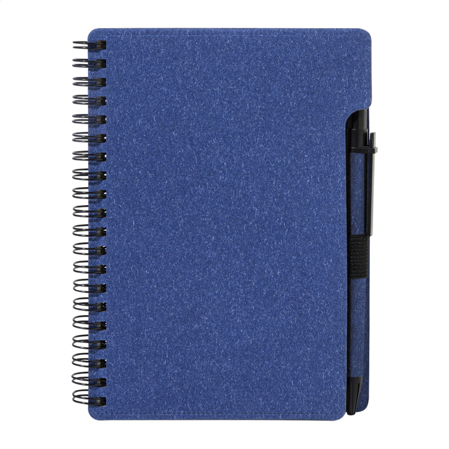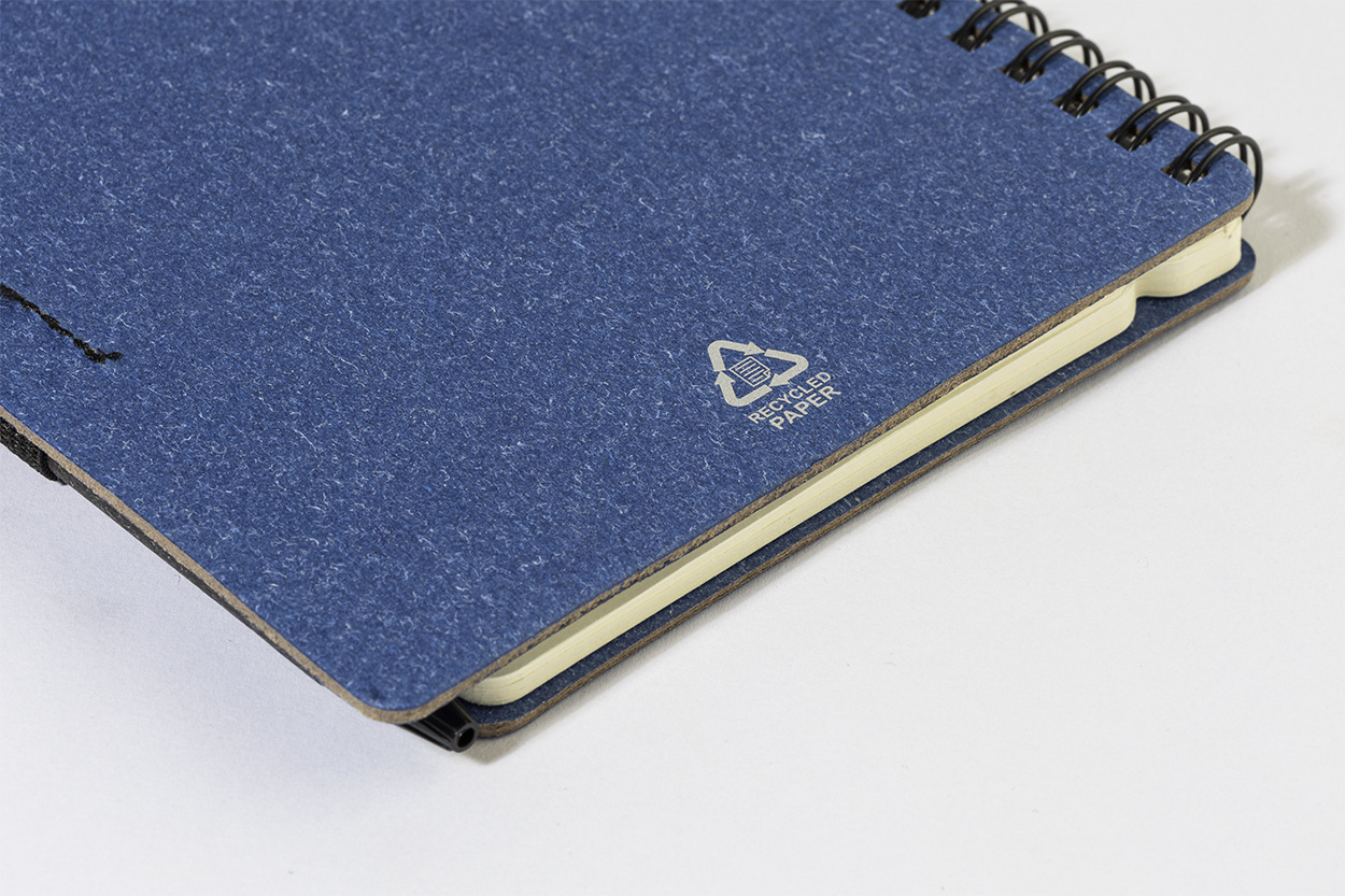 Špirálový blok A6 z recyklovaného papiera s 80 linajkovými listami. Vrátane recyklovaného papiera a guľôčkového pera z recyklovaného PP s modrou náplňou.