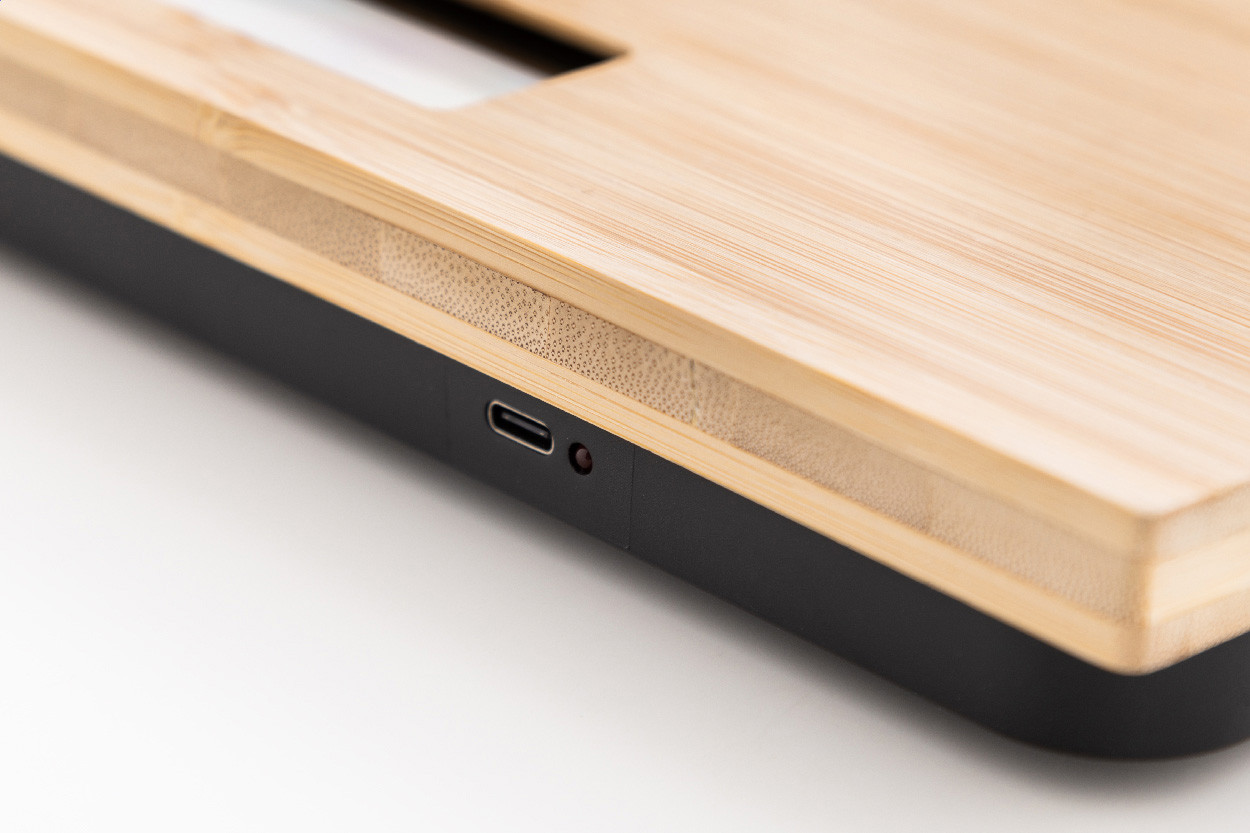 Digitálna kúpeľnová váha s bambusovou vážiacou plošinou. Hmotnosť: 150 kg, stupnice 0,1 kg, merné jednotky: kg/lb/st. S vstavanou dobíjacou batériami. Včetne USB nabíjacieho kábla.
