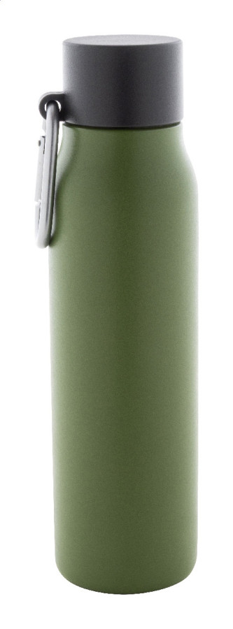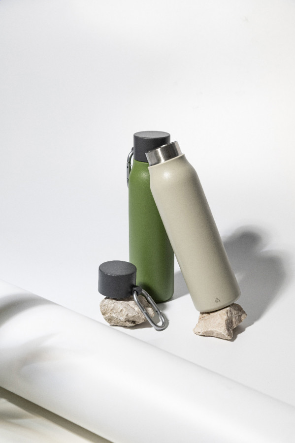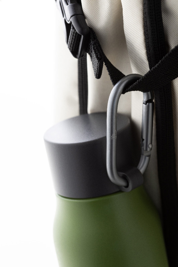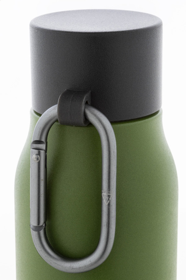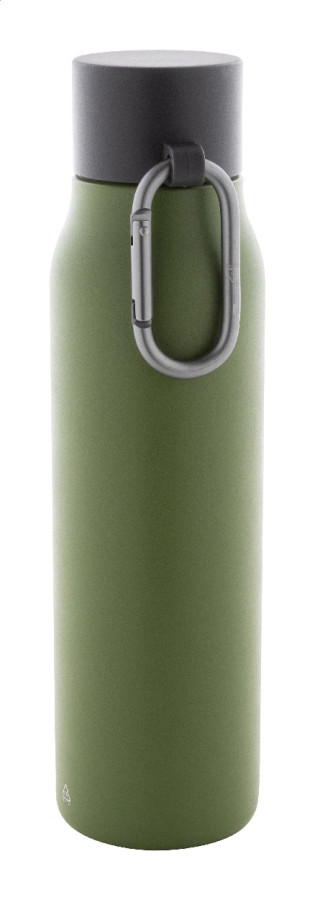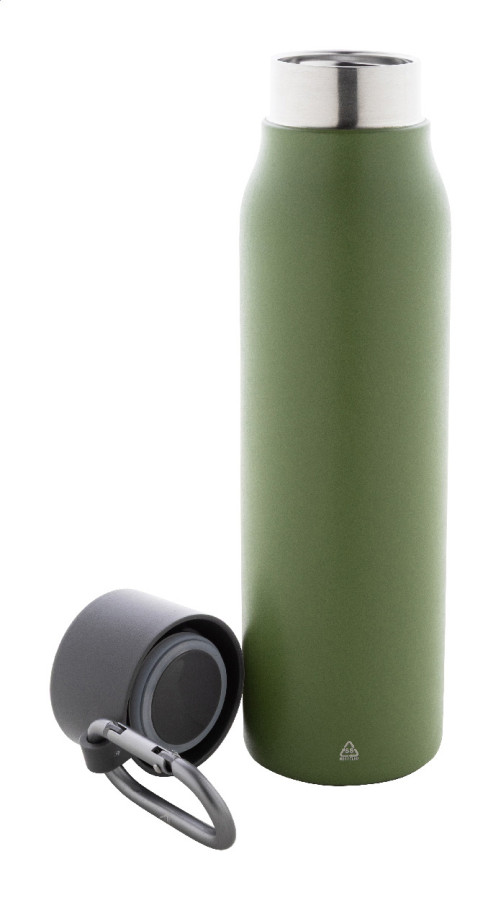 Dvojstenná vákuová fľaša z recyklovanej nerezovej ocele s viečkom z PP a karabínou z recyklovaného hliníka. 500 ml.