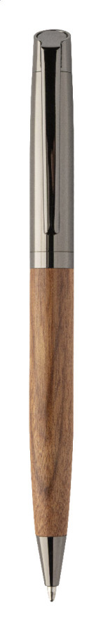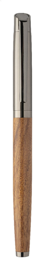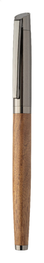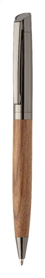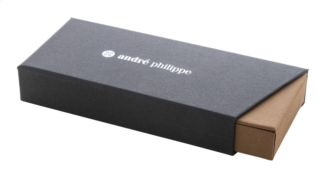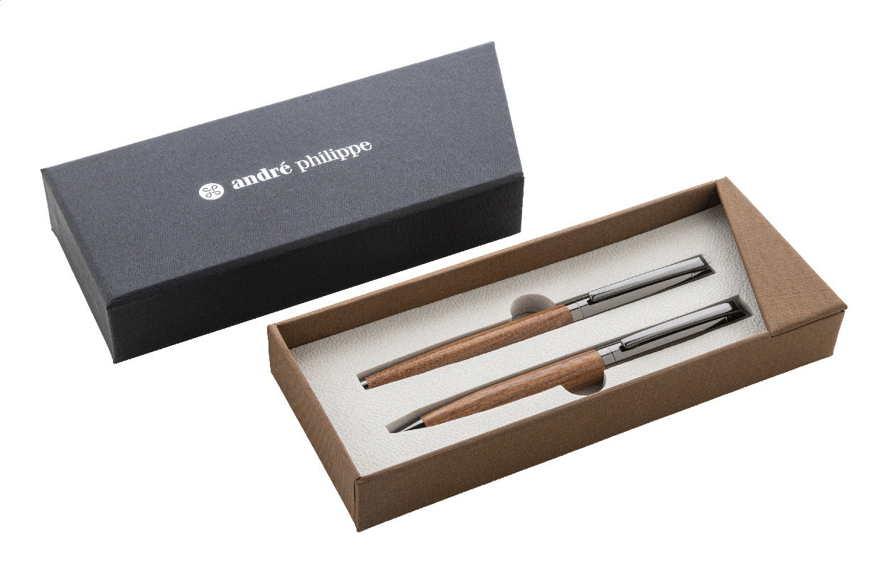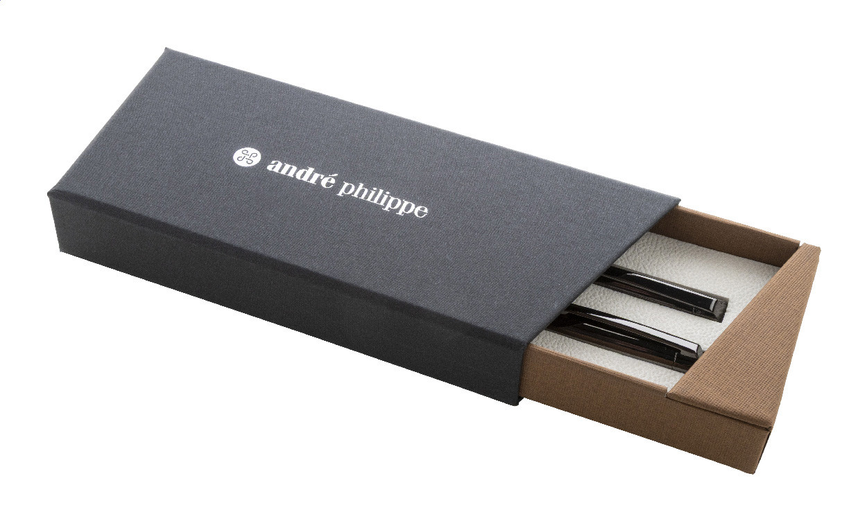 Elegantná sada kovového guľôčkového pera a rollera s dreveným telom a lesklými detailmi vo farbe antracit. V dvojfarebnej darčekovej krabičke s modrou náplňou. Produkt značky André Philippe.