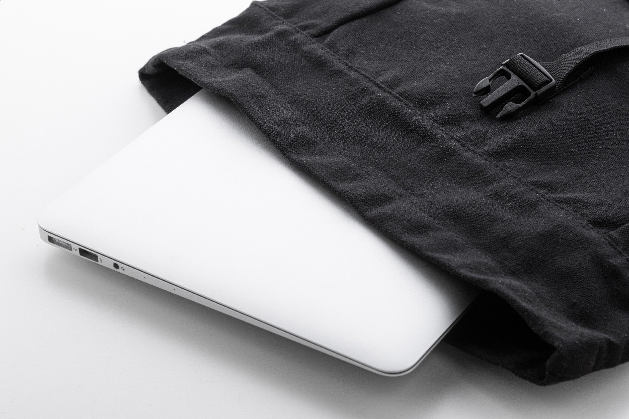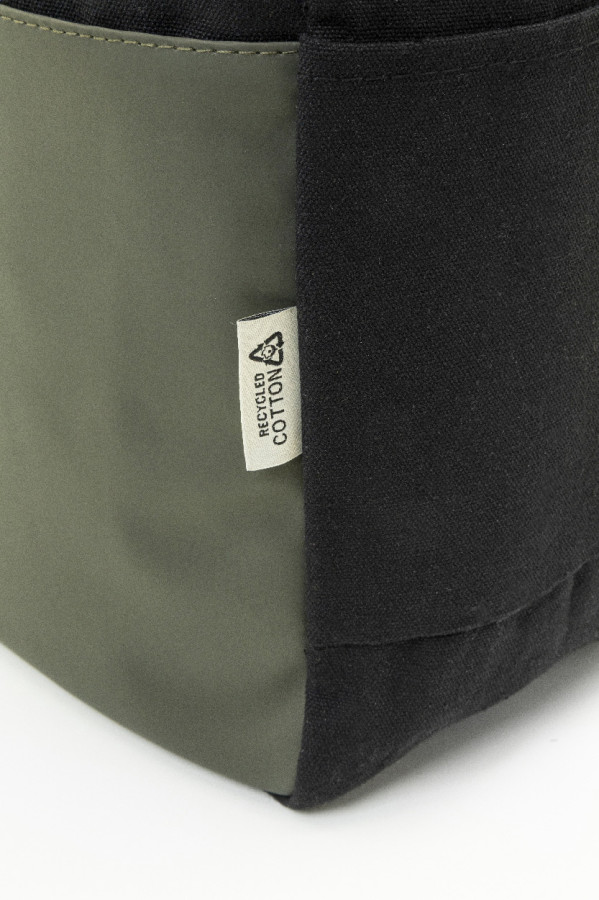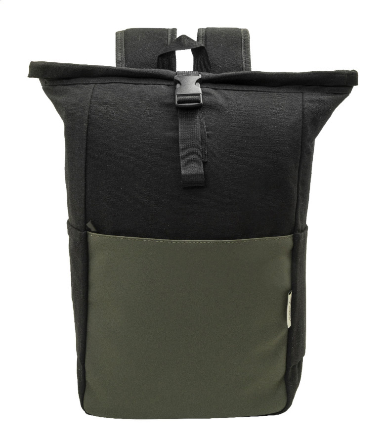 Rolovací batoh z recyklovaného plátna, zapínaním na pracku a predným vreckom na zips z mäkkej recyklovanej PU kože. S polstrovanou priehradkou na notebook (15"), bočnými vreckami, polstrovaným chrbtom a ramennými popruhmi. 70% recyklovanej bavlny a 30% RPET polyesteru. S výrazným štítkom z recyklovanej bavlny.