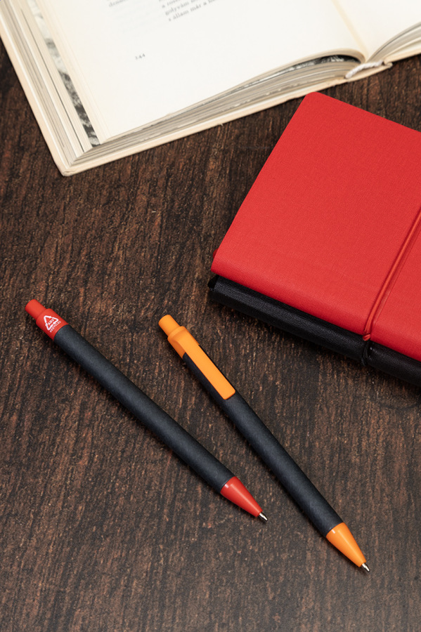 Guľôčkové pero z recyklovaného papiera s čiernym telom a recyklovanými ABS dielmi. S modrou náplňou.