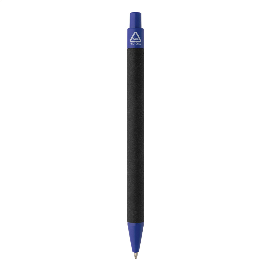 Guľôčkové pero z recyklovaného papiera s čiernym telom a recyklovanými ABS dielmi. S modrou náplňou.