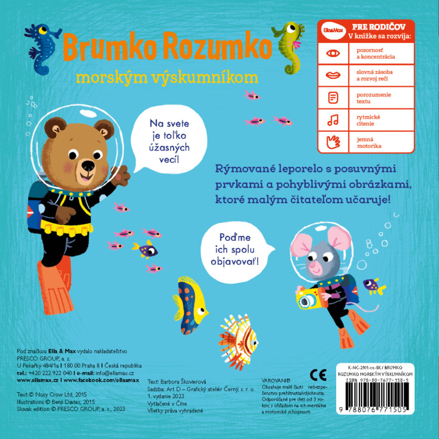 Poďte objavovať svet spolu s Brumkom! Rýmované leporelá s posuvnými prvkami a pohyblivými obrázkami malých čitateľov určite očaria. Knižkou ich bude sprevádzať milý medvedík, ktorý si hádam v každej situácii poradí… V sérii titulov, ktoré nesú jeho meno, sa postupne objavuje v najrôznejších úlohách. Či už bude kozmonautom, automechanikom, farmárom, potápačom, rušňovodičom alebo veterinárom, Brumko Rozumko zvládne všetko ľavou zadnou!