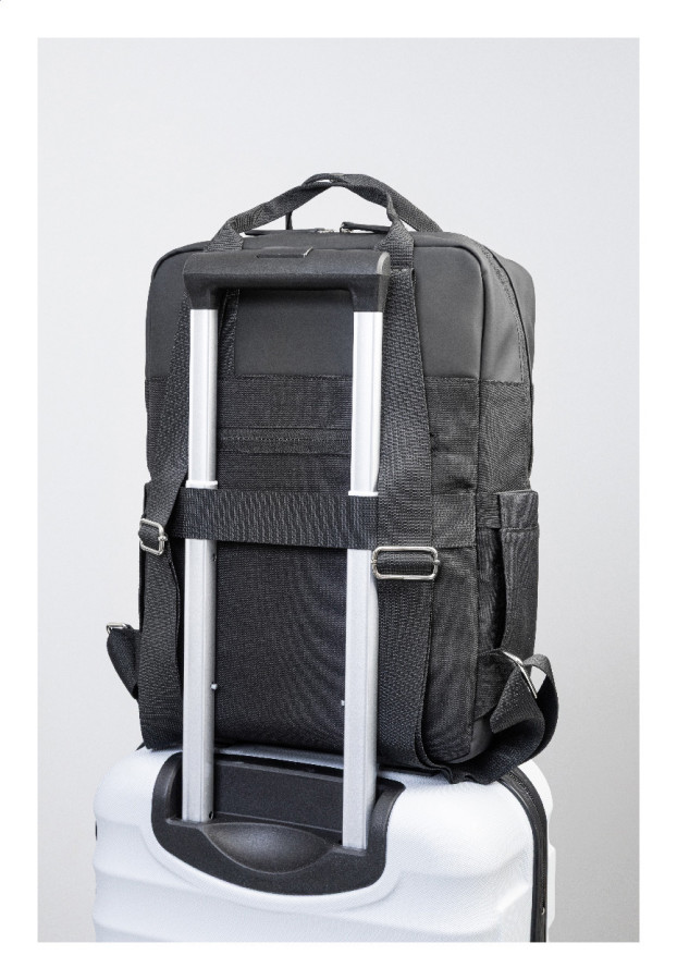 Batoh RPET s vrchnou časťou z mäkkej PU kože, priehradkou na zips, predným vreckom na zips, bočnými vreckami a vreckom proti krádeži. S rolovacím popruhom, polstrovaným chrbtom a priehradkou na notebook (15"). 900D polyester RPET s výraznou nálepkou RPET. V netkanom vrecku na prach z RPET.
