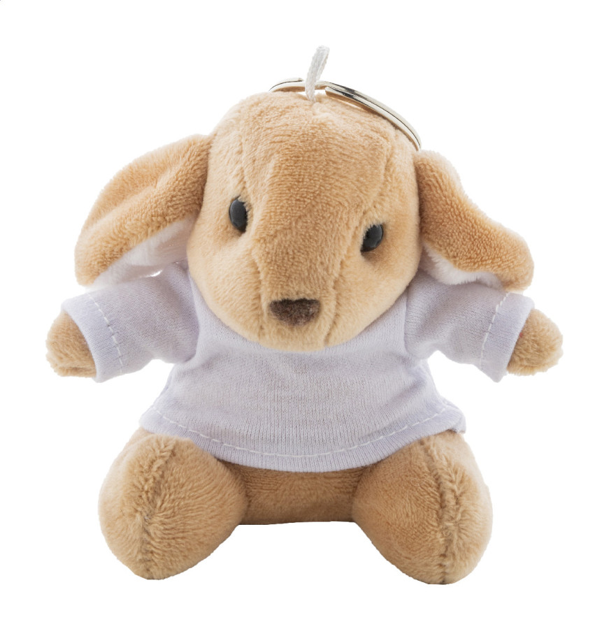 Plyšový prívesok na kľúče so zajacom s tričkom na potlač.