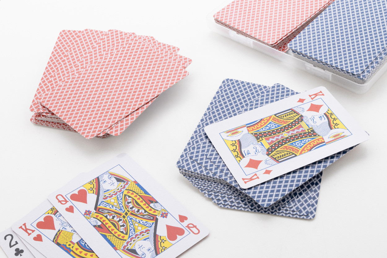 Súprava papierových francúzskych hracích kariet v krabičke z recyklovaného PP. Obsahuje dva štandardné balíčky po 54 kartách s červenou a modrou zadnou stranou.
