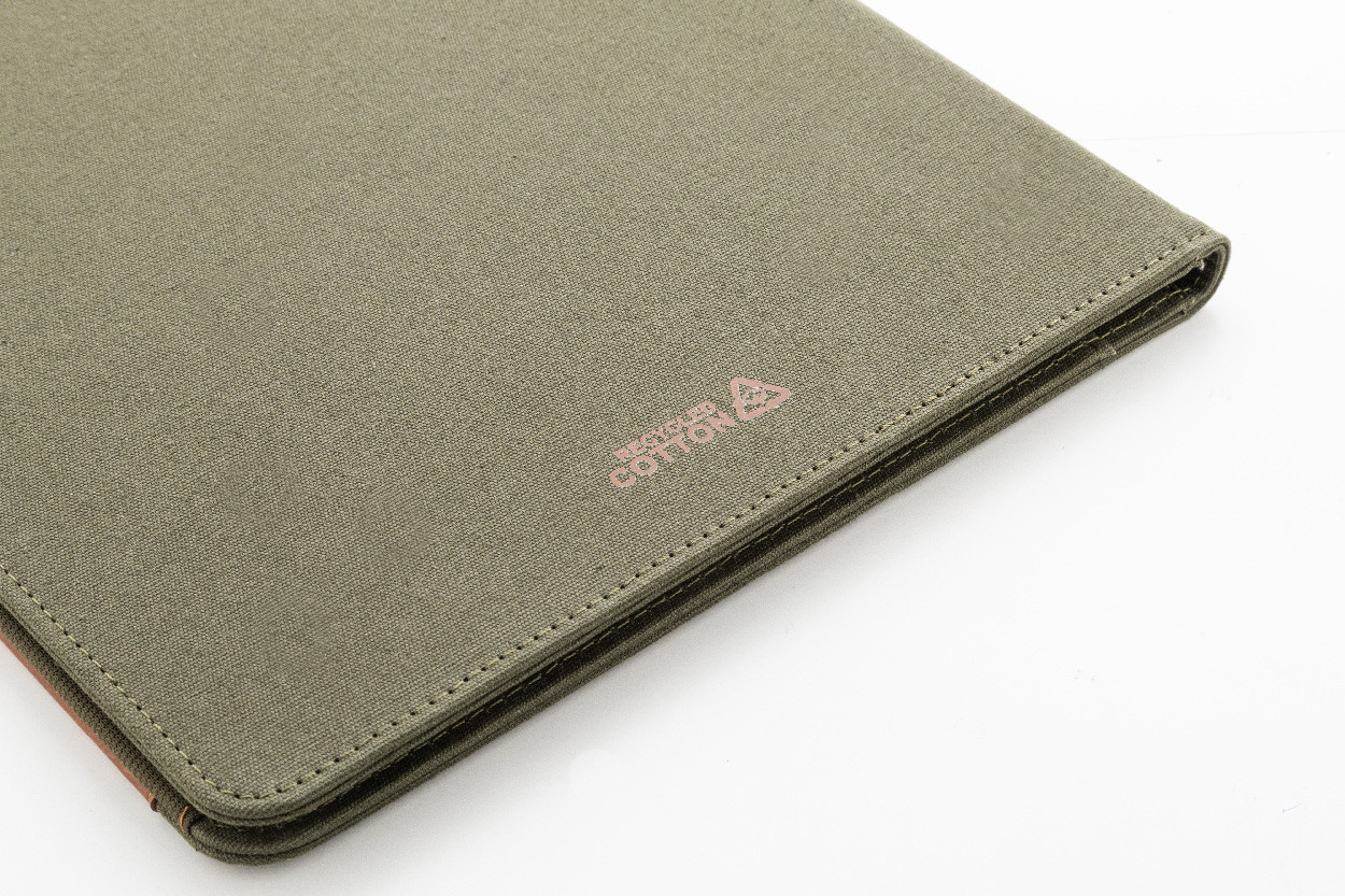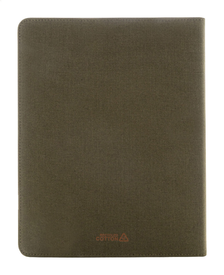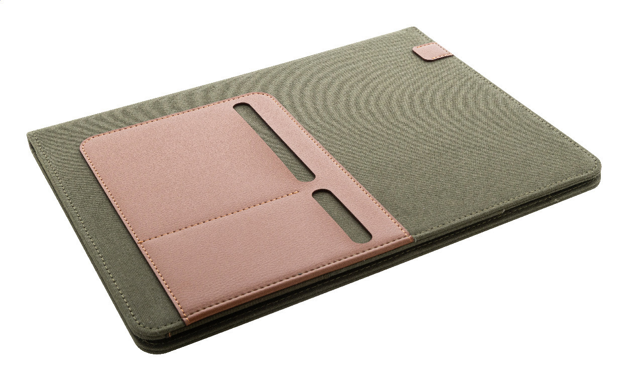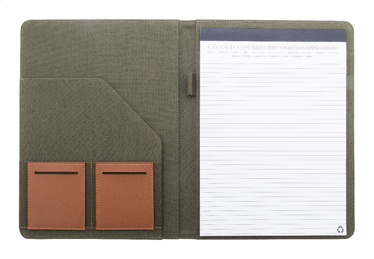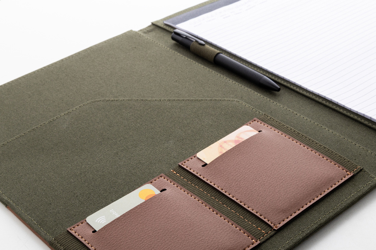 Zložka na dokumenty A4 z recyklovaného plátna a recyklovanej umelej kože s niekoľkými prednými a vnútornými vreckami. S blokom na 20 linkovaných listov z recyklovaného papiera. 70% recyklovanej bavlny a 30% RPET polyesteru.