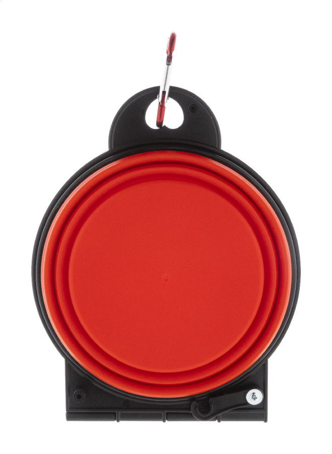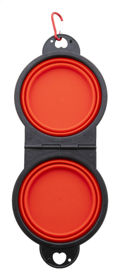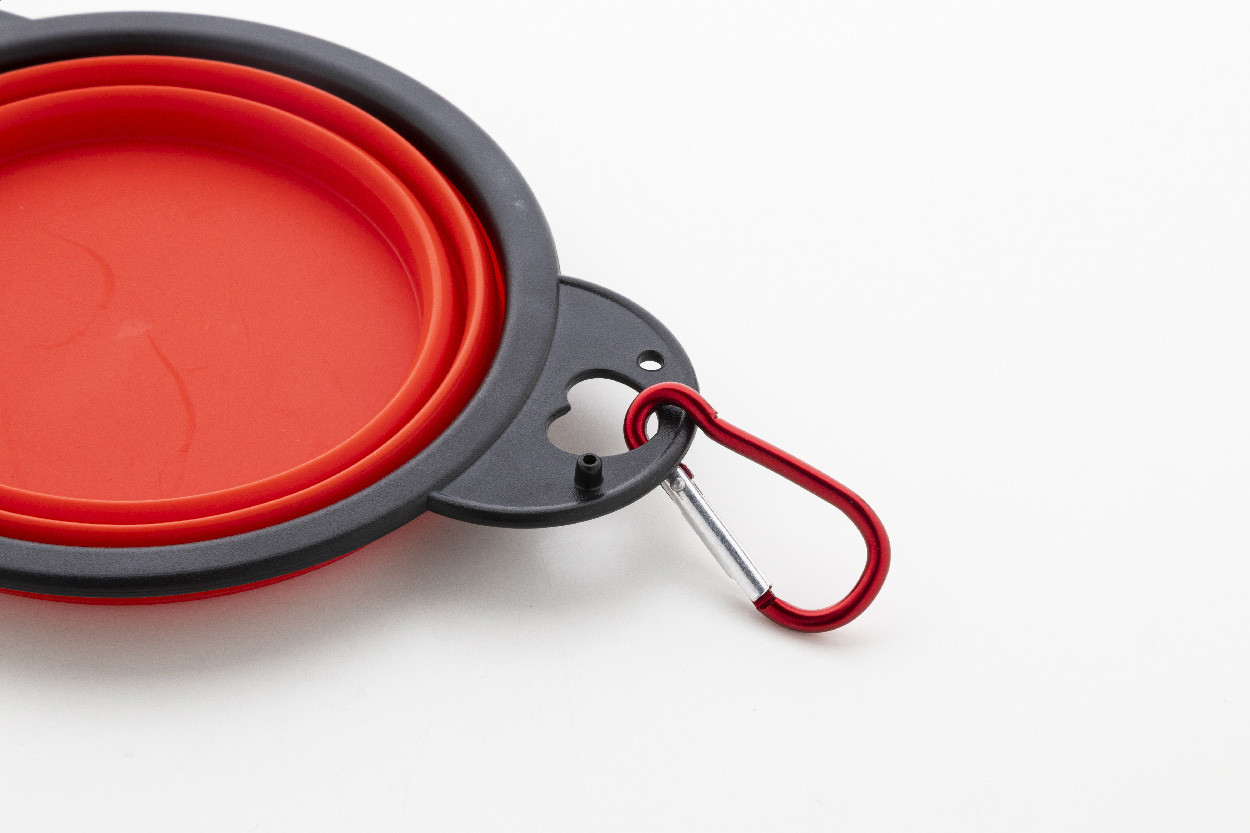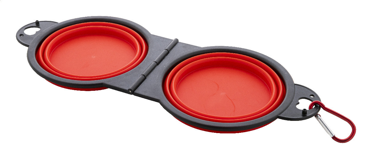 Skladacia miska pre domácich miláčikov z odolného TPE s dvoma priehradkami s objemom 450 ml a farebne zladenou hliníkovou karabínou.