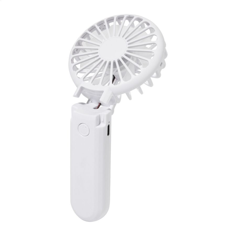 Elektrický ručný vetráčik z recyklovaného ABS plastu so vstavanou dobíjacou batériou cez USB (400 mAh). S nastaviteľným uhlom hlavy a 3 rýchlosťami. Vrátane USB kábla na nabíjanie.