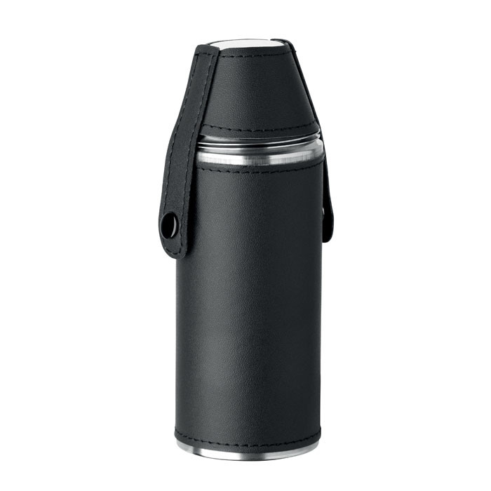 Placatka z nerezové oceli s povrchem z PU kůže. Dva nerezové 20ml panáky ve víčku. Objem placatky: 230 ml.