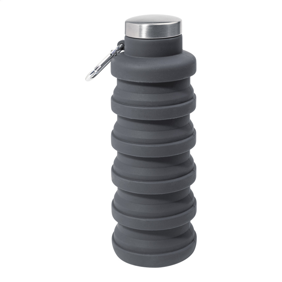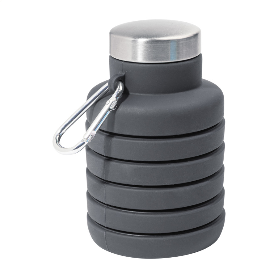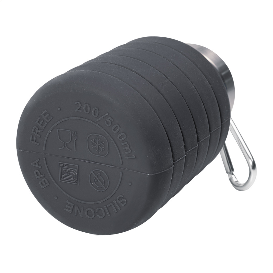 Skladacia silikónová fľaša s viečkom z nerezovej ocele a hliníkovou karabínou. 500 ml