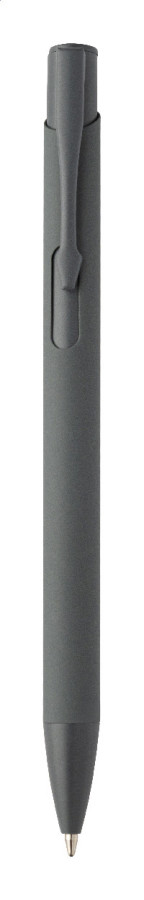 Guľôčkové pero z recyklovaného hliníka s pogumovaným telom a farebnými lesklými kovovými dielmi. So špeciálnym povrchom na zrkadlové gravírovanie, ktoré zodpovedá kovovým častiam. S modrou náplňou.