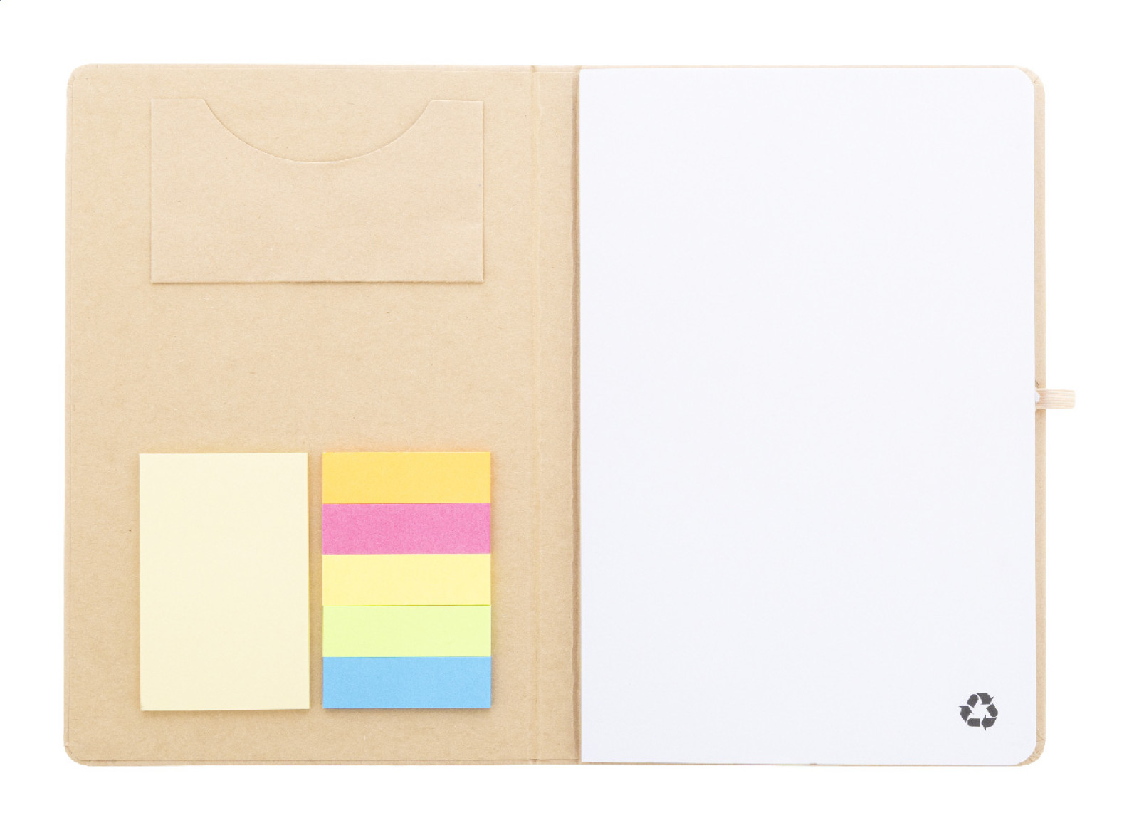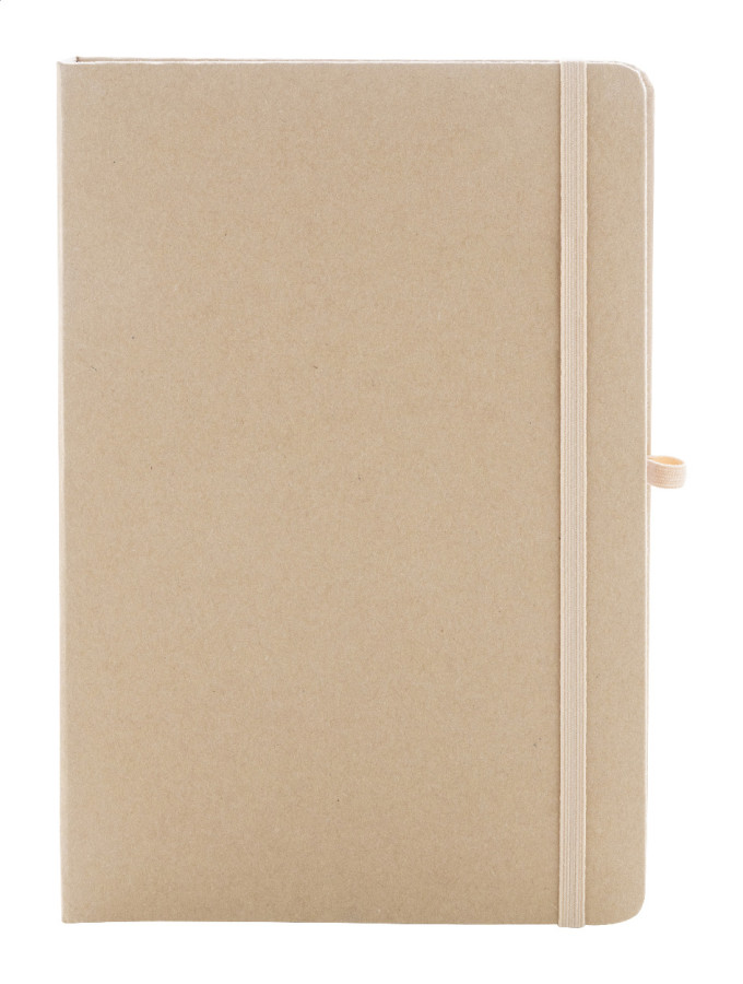 Blok A5 z recyklovaného kartónu so 70 prázdnymi listami z recyklovaného papiera. Vnútorný obal obsahuje 25 samolepiacich papierikov, 125 značkovačov stránok a vrecko na vizitky. S gumovým popruhom a držiakom na pero.