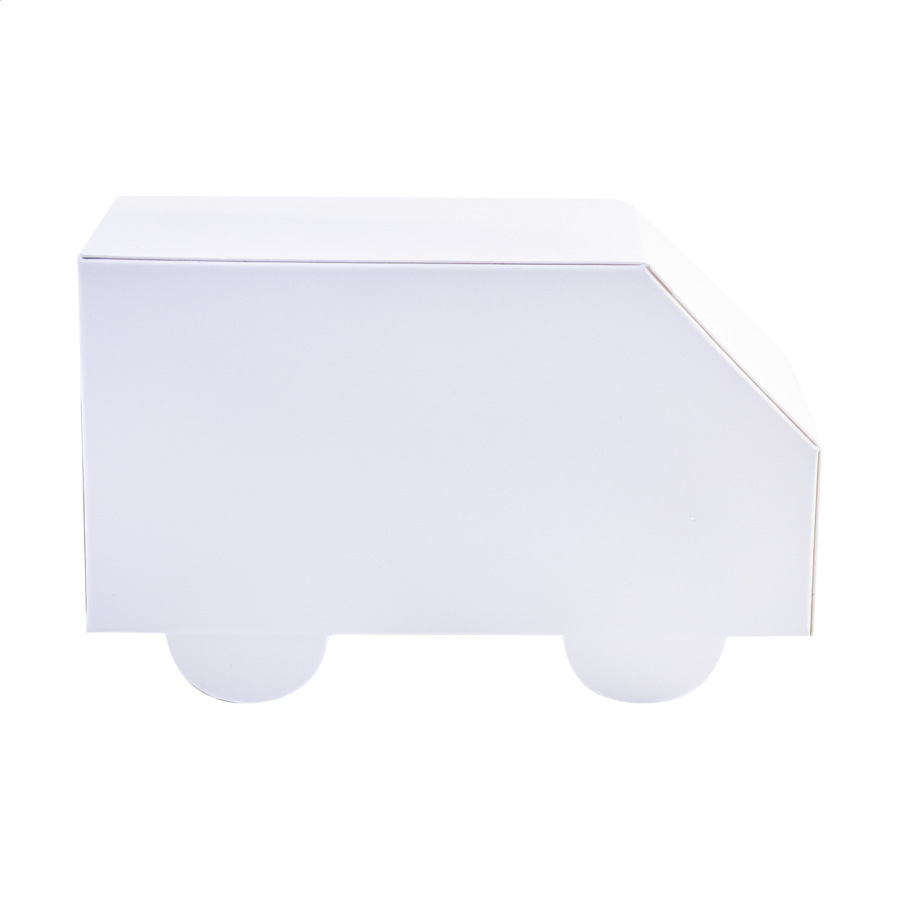 Krabička na cukríky v tvare nákladného auta na zákazku s celofarebnou potlačou. Naplnené 40 gramami jednotlivo balených ovocných cukríkov. Cena nezahŕňa tlačovú prípravu. Min. mn.: 100 ks.