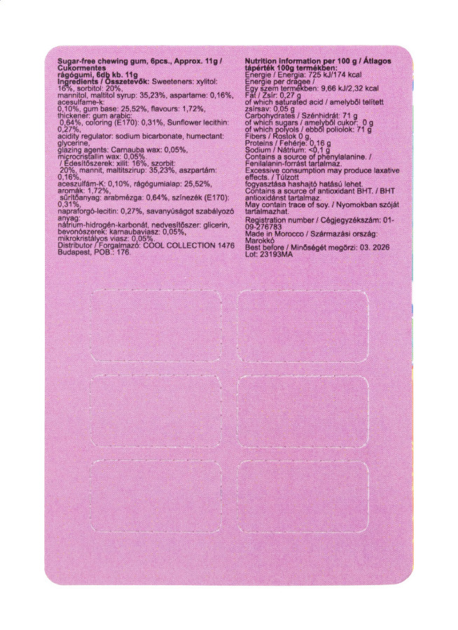 6 ks žvýkaček bez cukru v blistri na zákazku, s farebným potištěným perforovaným papierovým obalem. Cena nezahrnuje tlačovú prípravu. Min. min.: 100 ks.