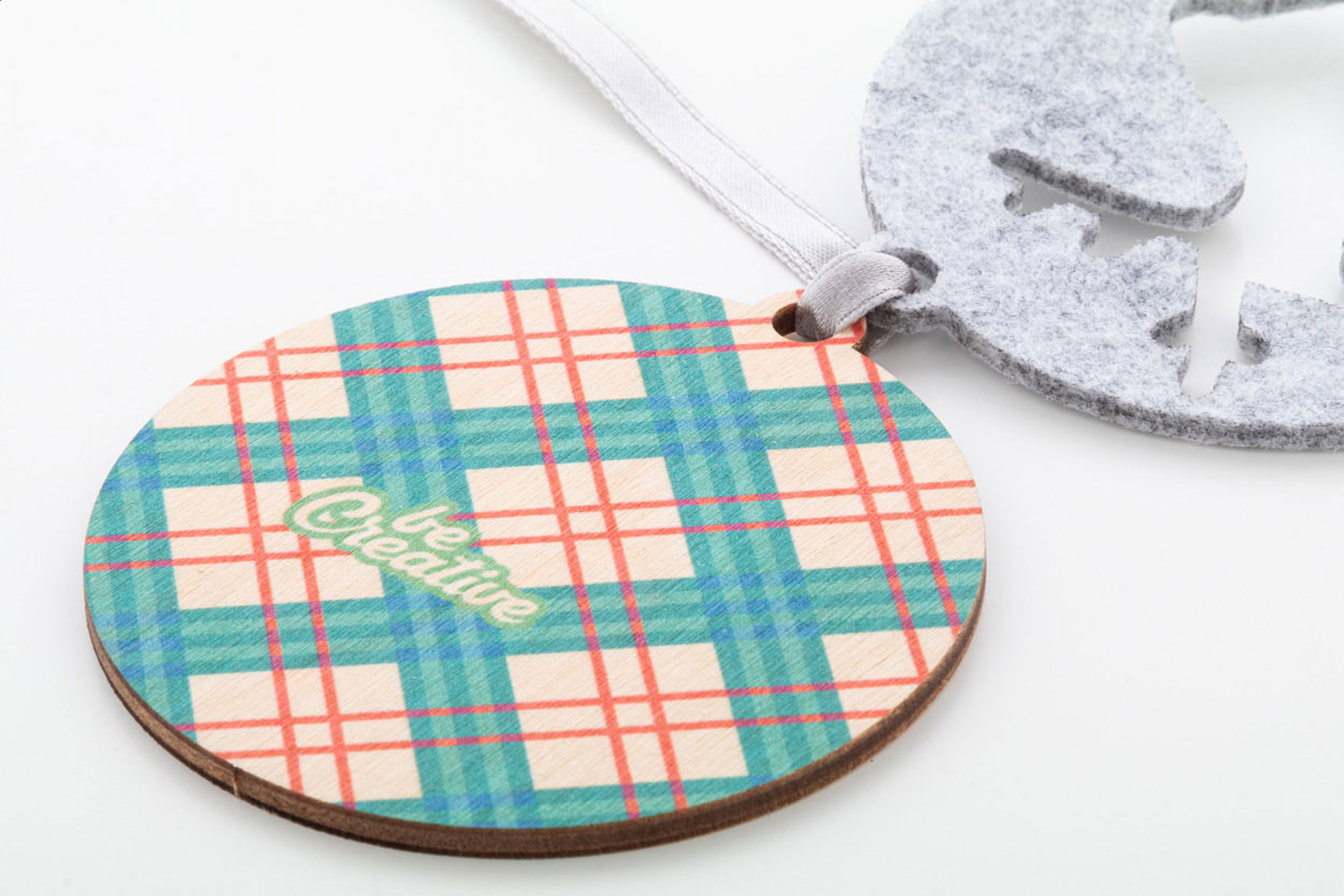 Ozdoba na vianočný stromček z dvojvrstvovej RPET plsti a brezovej preglejky vyrobená na zákazku s celostriebornou stuhou a vysekávaným vianočným dizajnom na hornej vrstve. Cena zahŕňa UV LED potlač na spodnej vrstve, nezahŕňa tlačovú prípravu. Min. mn.: 100 ks.