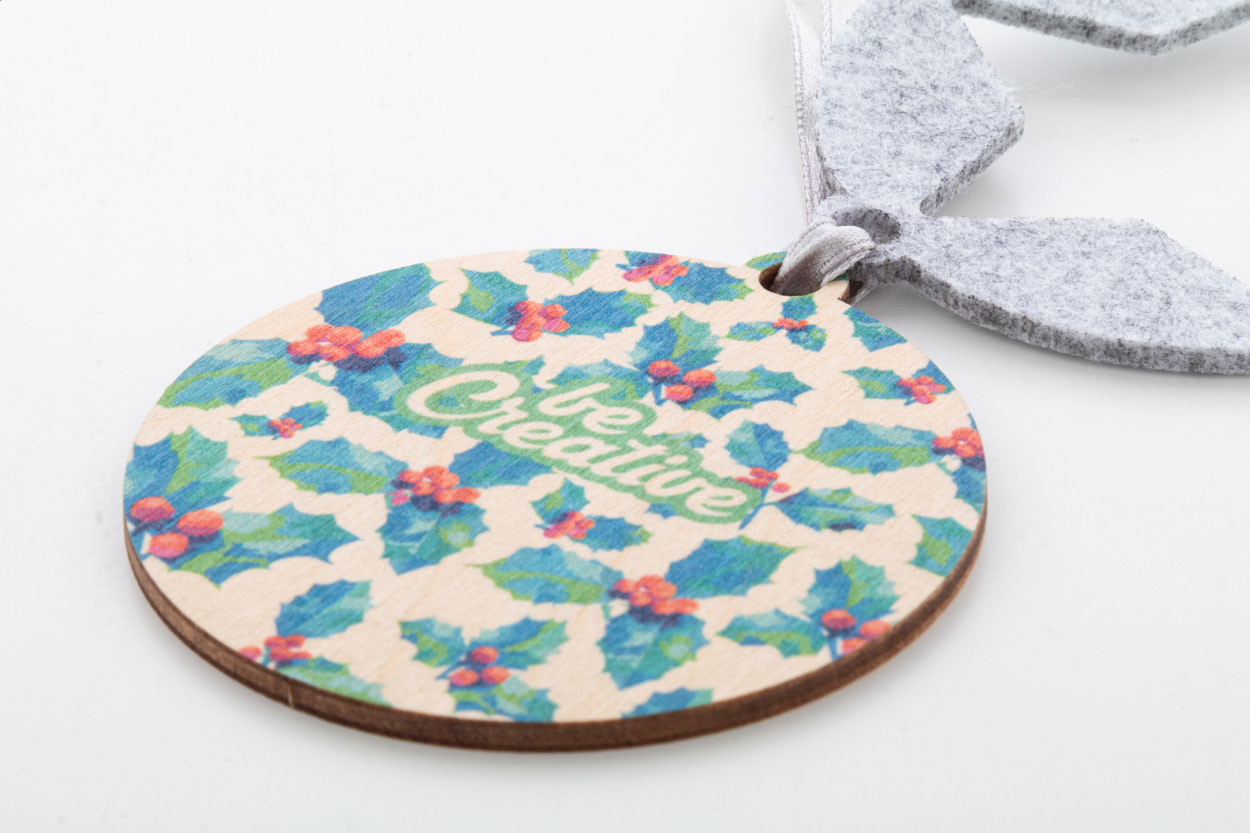 Ozdoba na vianočný stromček z dvojvrstvovej RPET plsti a brezovej preglejky vyrobená na zákazku s celostriebornou stuhou a vysekávaným vianočným dizajnom na hornej vrstve. Cena zahŕňa UV LED potlač na spodnej vrstve, nezahŕňa tlačovú prípravu. Min. mn.: 100 ks.