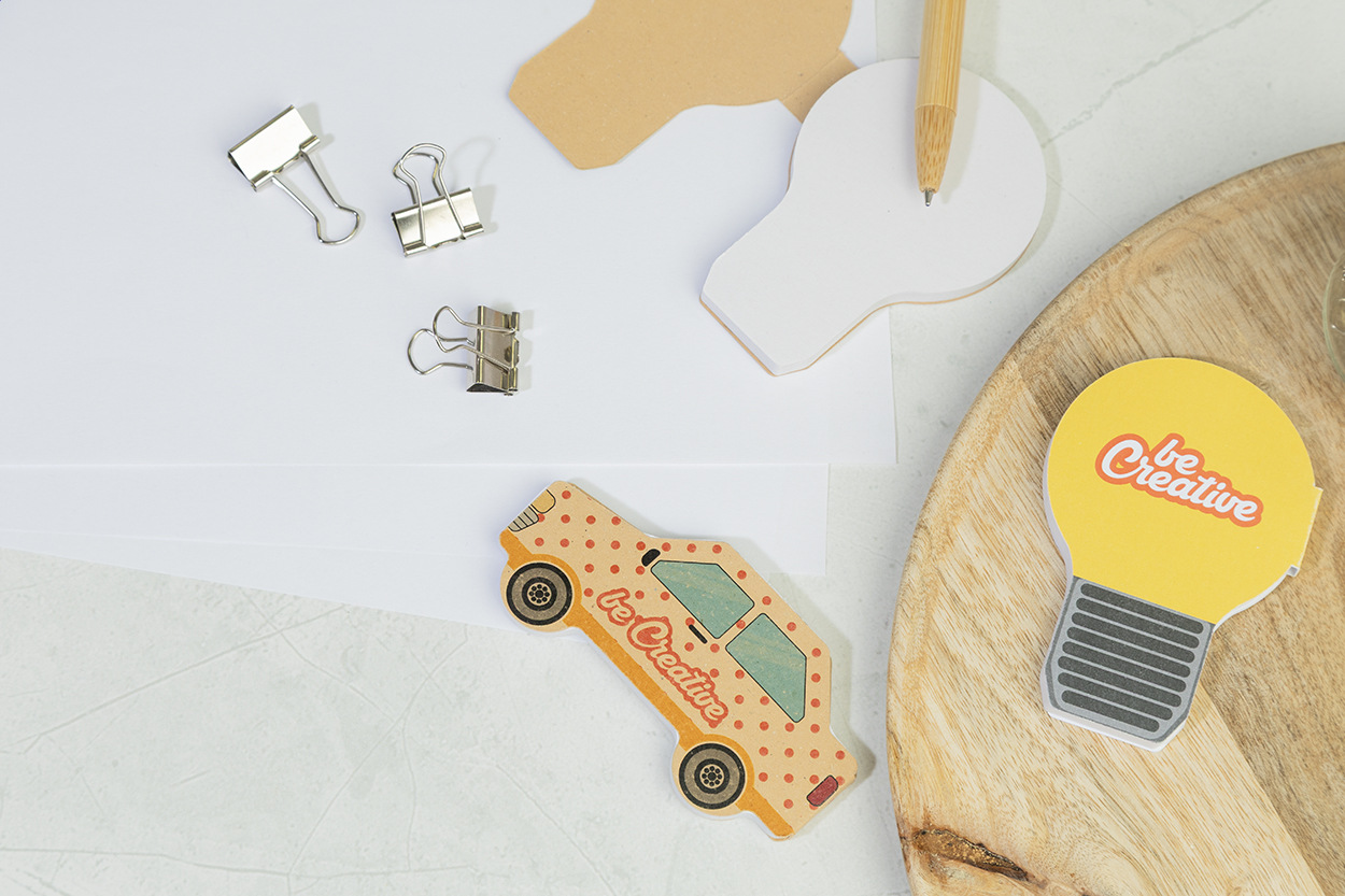 Samolepiaci blok v tvare žiarovky na zákazku, potiahnutý papierom. Obsahuje 50 listov samolepiacich papierov z recyklovaného papiera. Cena zahŕňa vonkajší obal s plnofarebnou potlačou, nezahŕňa tlačovú prípravu. Min. mn: 100 ks.