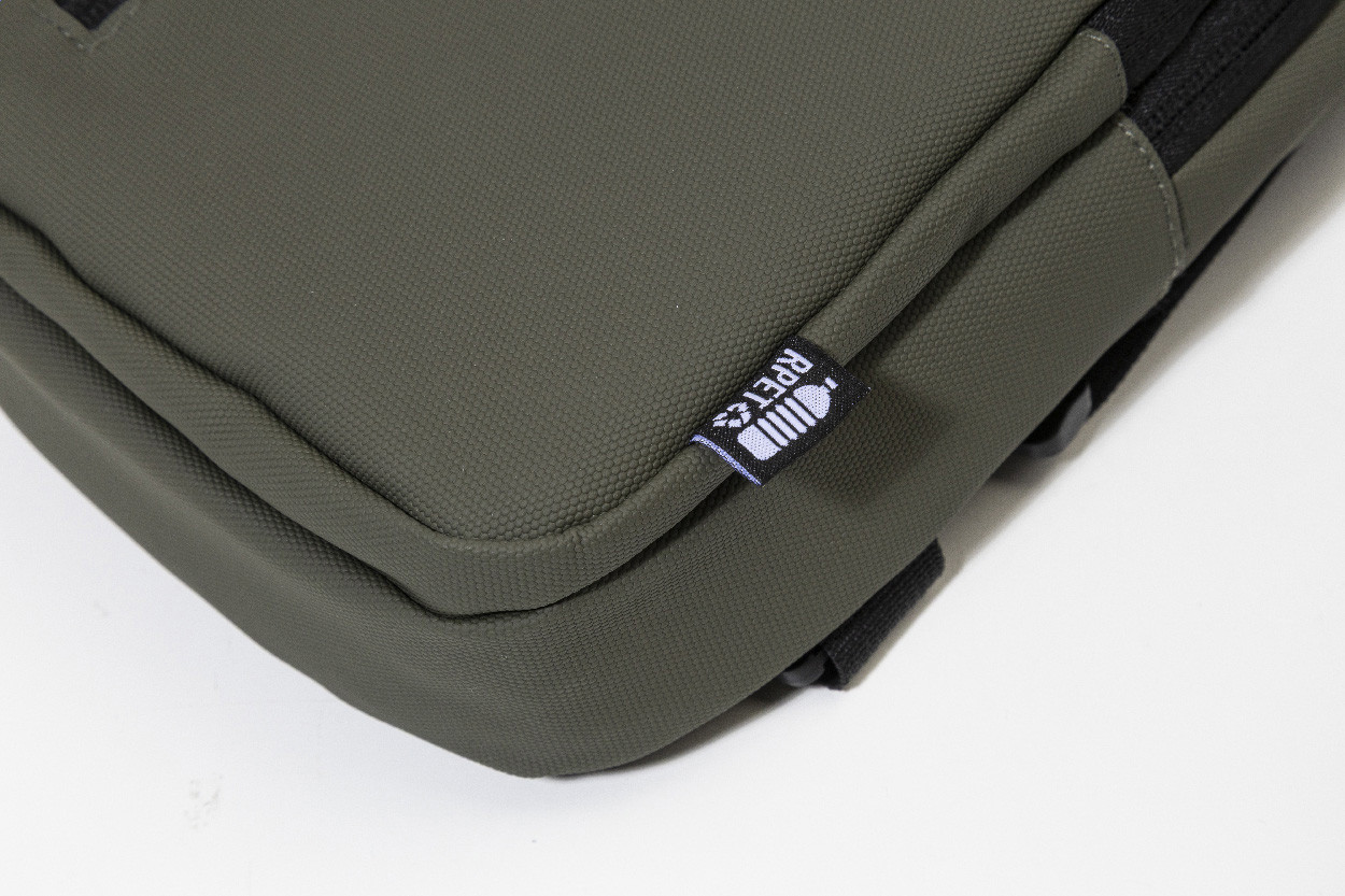 Vodeodolná RPET crossbody taška na zavesenie cez rameno s vreckami na zips, zapínaním na pracku a polstrovaným chrbtom. S nastaviteľným ramenným popruhom vybaveným polohami na ľavej a pravej strane. Polyester RPET 600D potiahnutý PU, s výraznou etiketou RPET.