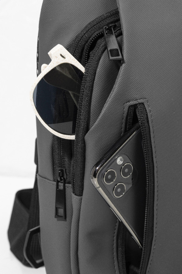 Vodeodolná RPET crossbody taška na zavesenie cez rameno s vreckami na zips, zapínaním na pracku a polstrovaným chrbtom. S nastaviteľným ramenným popruhom vybaveným polohami na ľavej a pravej strane. Polyester RPET 600D potiahnutý PU, s výraznou etiketou RPET.