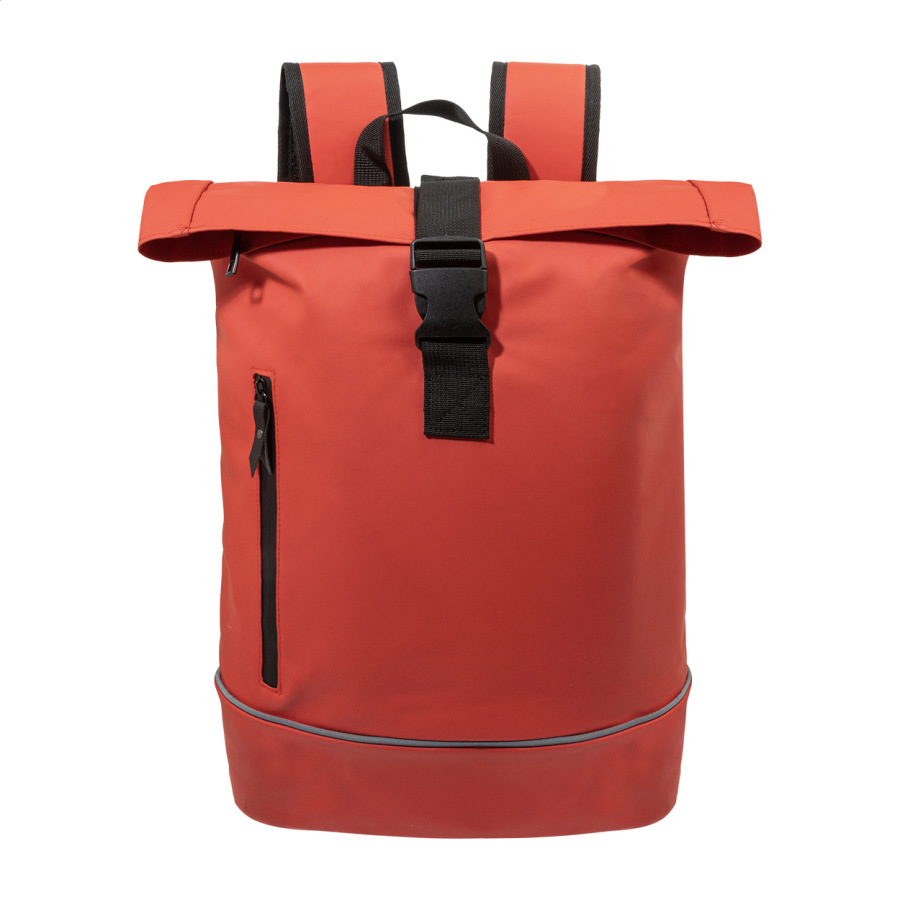 Vodeodolný batoh s rolovacím vrškom z mäkkej recyklovanej PU kože s hlavnou priehradkou na zips a zapínaním na pracku, predným vreckom s vodeodolným zipsom, polstrovanou priehradkou na notebook (15") a reflexným prúžkom. S polstrovaným chrbtom a ramennými popruhmi.