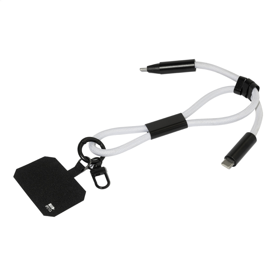 Náramok z RPET s držiakom na mobil, vložkou pre telefón, karabínou a integrovaným nabíjacím káblom USB-C/USB-C so skrytými konektormi. Podporuje rýchle nabíjanie a prenos dát PD s výkonom 60 W.