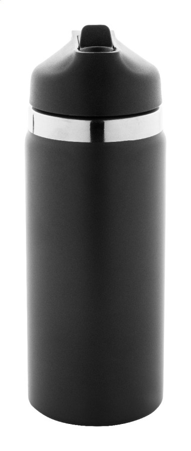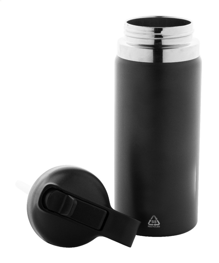 Dvojstenná vákuová fľaša z recyklovanej nerezovej ocele s odklápacím viečkom z PP, rukoväťou a integrovanou slamkou. 500 ml.