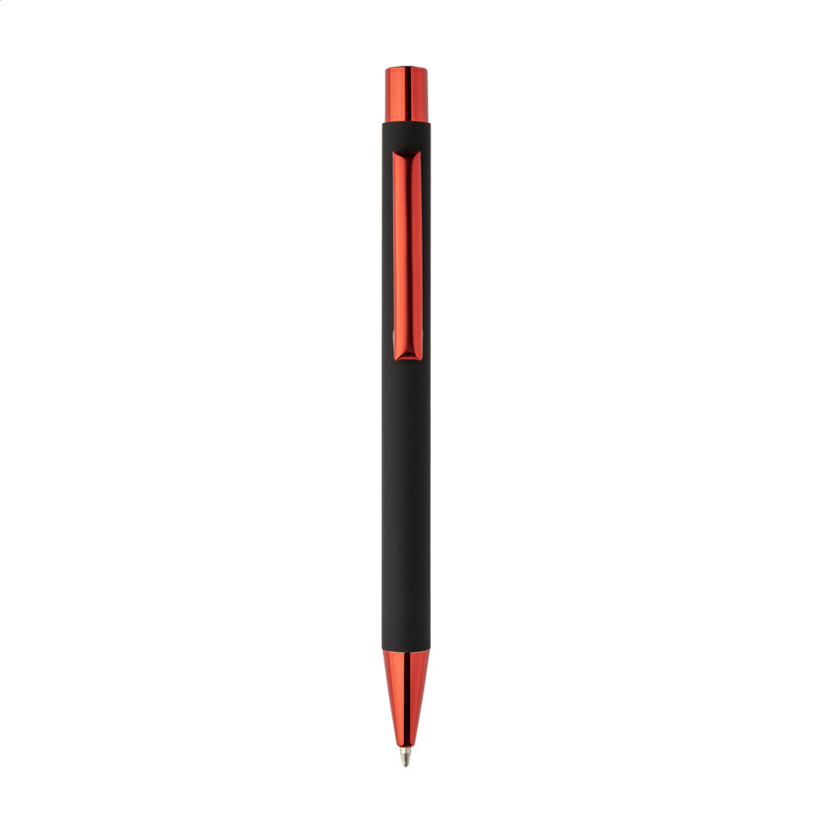Guľôčkové pero z recyklovaného hliníka s čiernym pogumovaným telom a farebnými lesklými kovovými časťami. So špeciálnym povrchom na zrkadlové gravírovanie, ktoré ladí s kovovými časťami. S modrou náplňou.