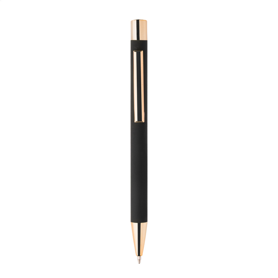 Guľôčkové pero z recyklovaného hliníka s čiernym pogumovaným telom a farebnými lesklými kovovými časťami. So špeciálnym povrchom na zrkadlové gravírovanie, ktoré ladí s kovovými časťami. S modrou náplňou.