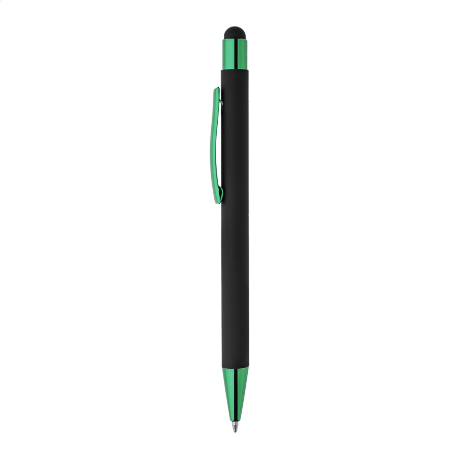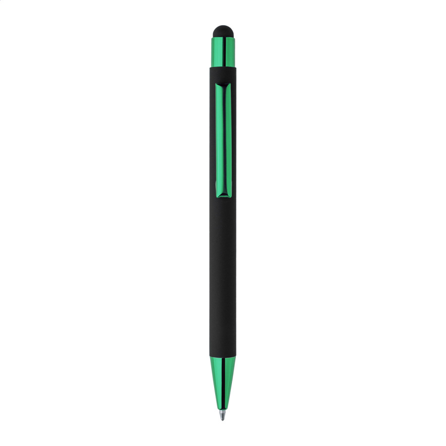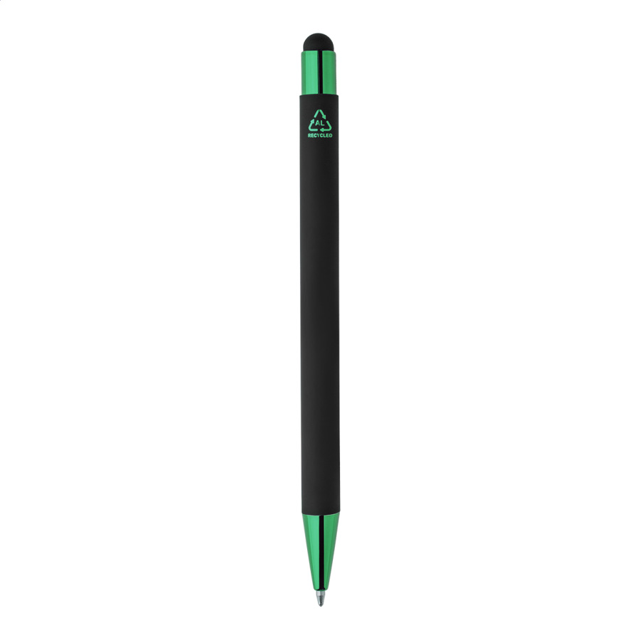 Guľôčkové pero z recyklovaného hliníka na dotykovú obrazovku, s čiernym pogumovaným telom a farebnými lesklými kovovými časťami. So špeciálnym povrchom na zrkadlové gravírovanie, ktoré ladí s kovovými časťami. S modrou náplňou.