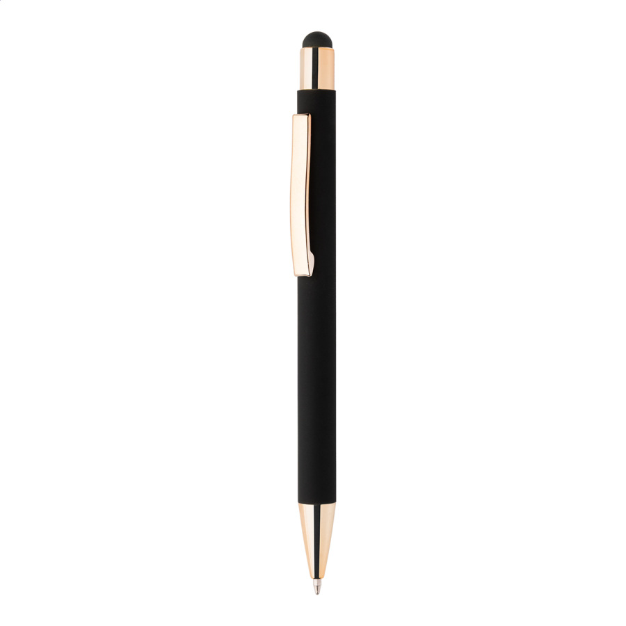 Guľôčkové pero z recyklovaného hliníka na dotykovú obrazovku, s čiernym pogumovaným telom a farebnými lesklými kovovými časťami. So špeciálnym povrchom na zrkadlové gravírovanie, ktoré ladí s kovovými časťami. S modrou náplňou.