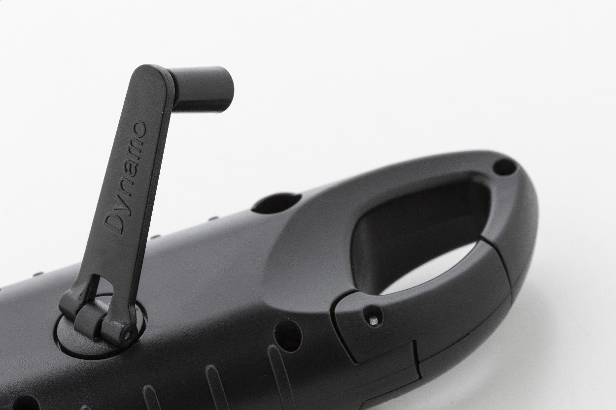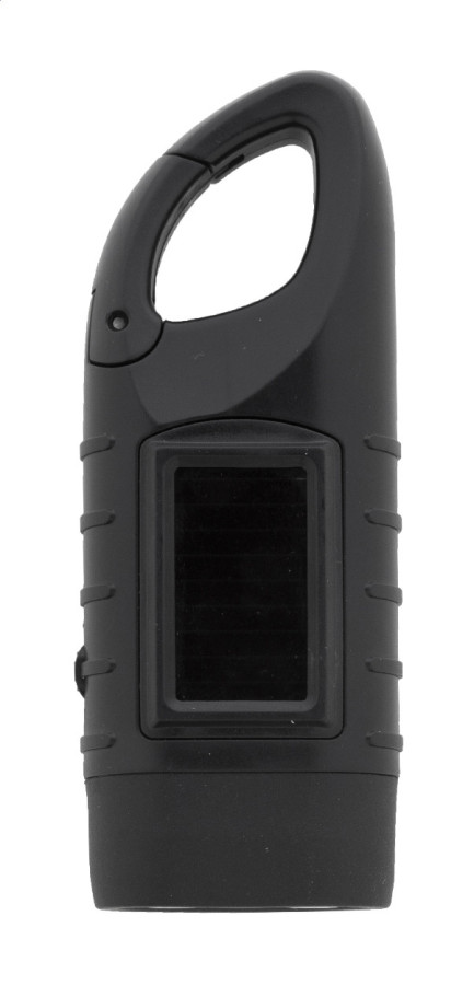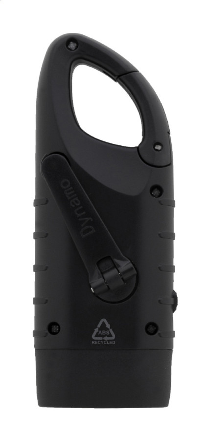 Baterka z recyklovaného ABS plastu s 3 LED diódami, vstavanými solárnymi a dynamovými nabíjačkami a karabínou.