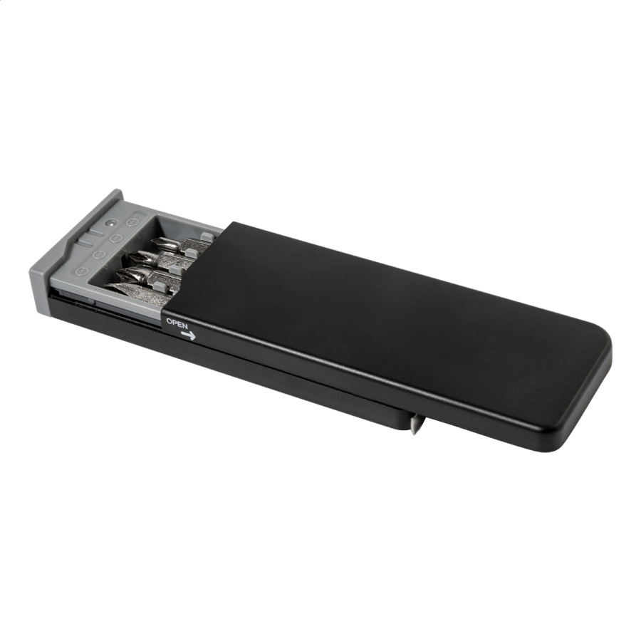 Kompaktná sada náradia v puzdre z recyklovaného ABS materiálu s 8 skrutkovacími bitmi a vstavaným 1m metrom.