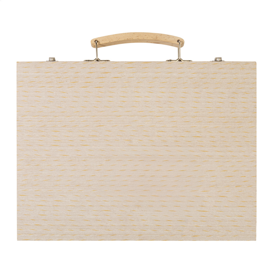 Komplexná 66dielna sada na kreslenie a vyfarbovanie v drevenej prepravnej krabičke. Obsahuje: 12 voskoviek, 12 olejových pastelov, 12 ceruziek, 12 fixiek, 12 akvarelových farieb s paletou a štetcom, pravítko, gumu, strúhadlo a lepidlo.