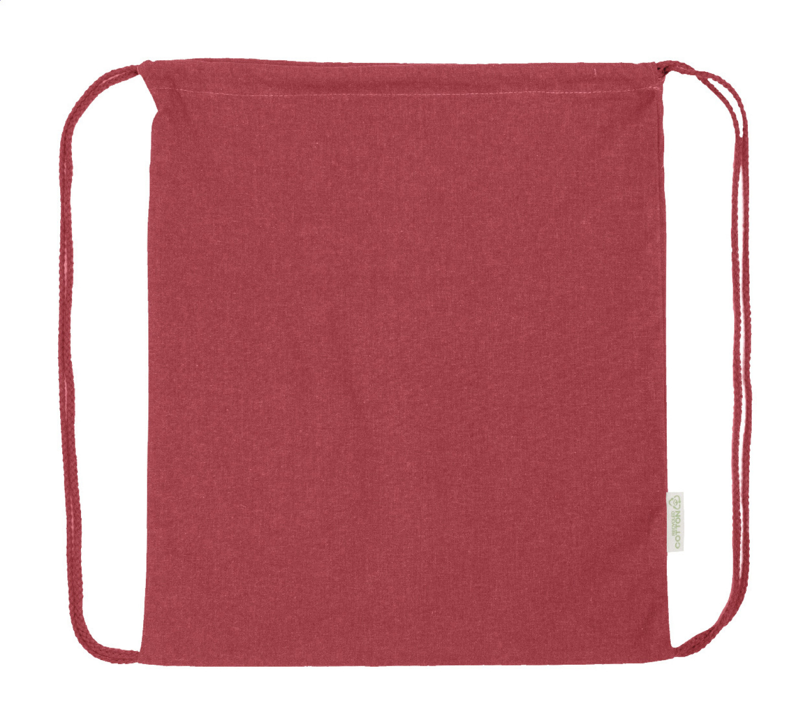 Vak so sťahovacou šnúrkou zo 70% recyklovanej bavlny a 30% polyesteru RPET, 140 g/m². S výrazným štítkom z recyklovanej bavlny.