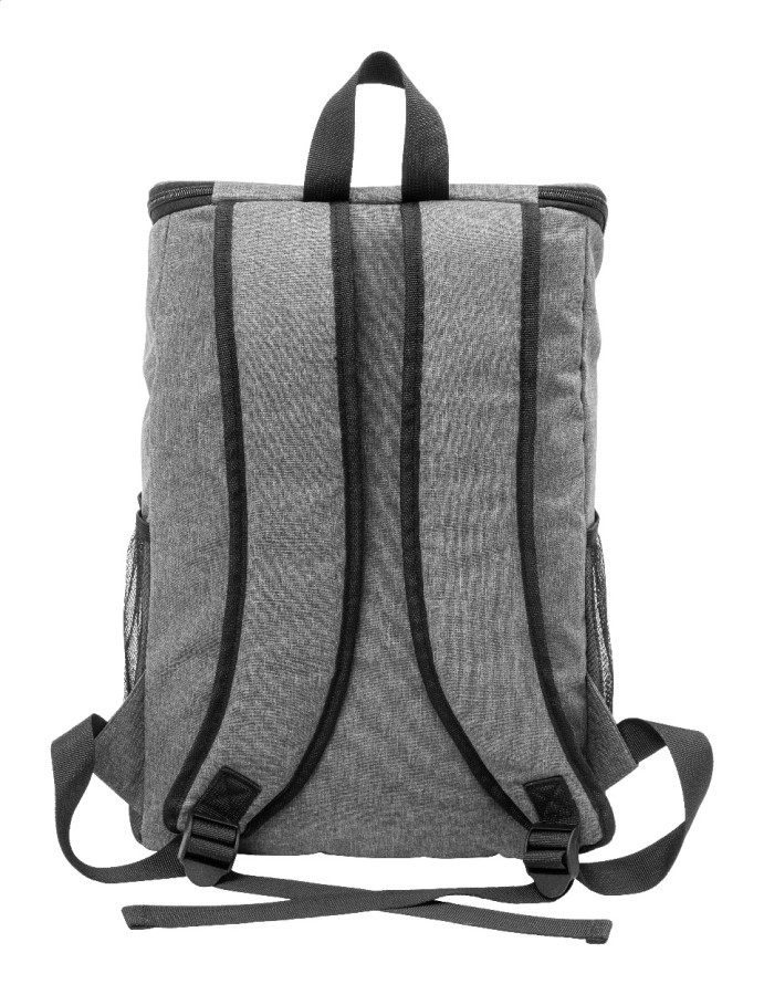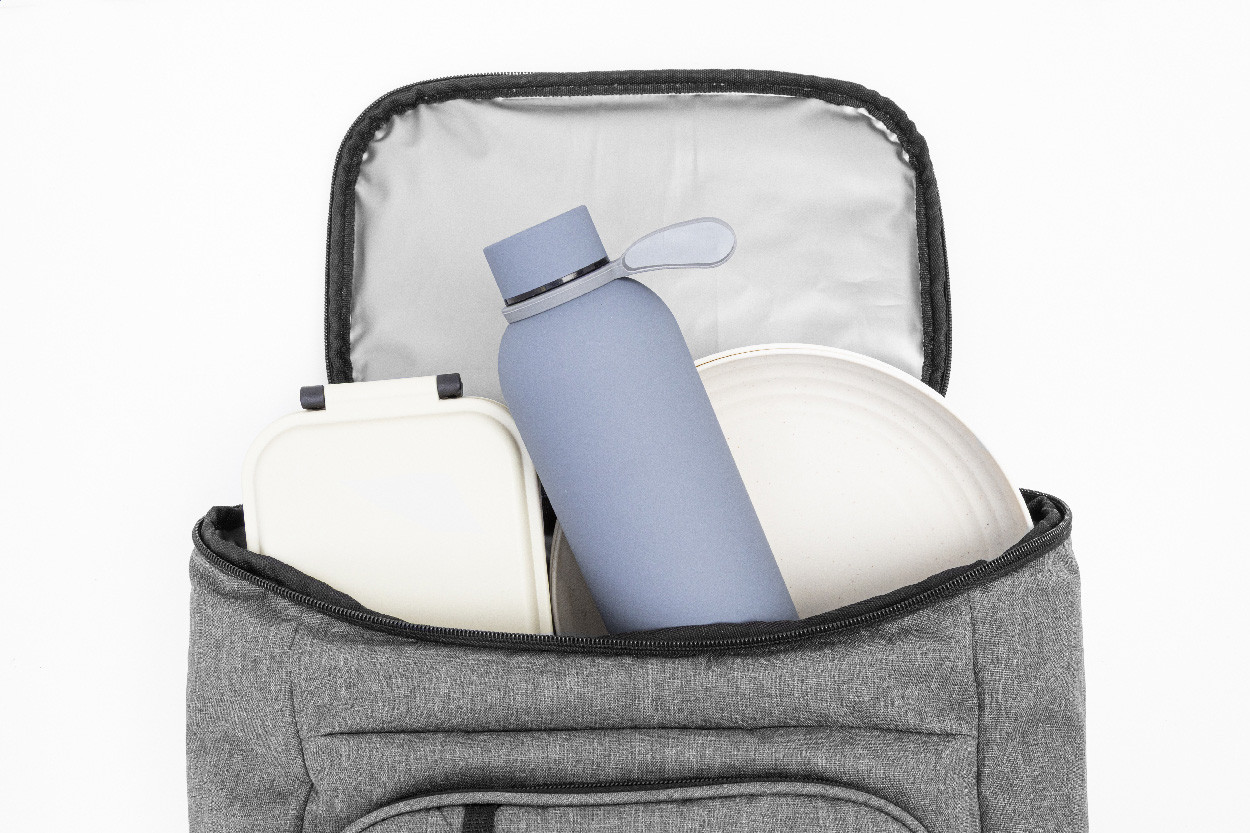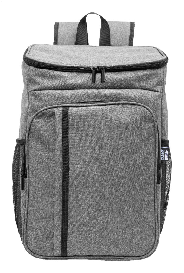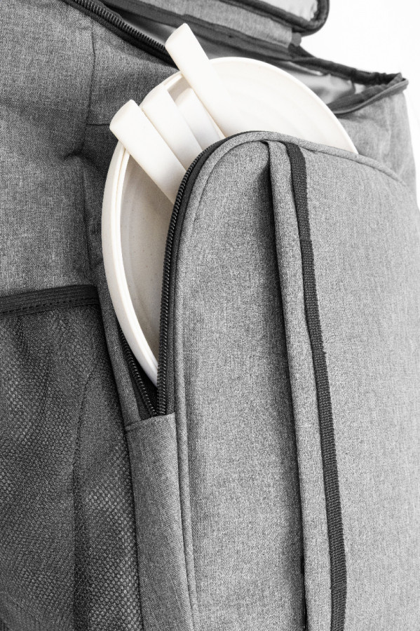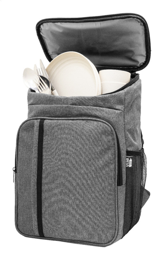 RPET chladiaci piknikový batoh s predným vreckom na zips a chladiacim priestorom na zips s PEVA polstrovaním. S bočnými sieťovanými vreckami, polstrovaným chrbtom a ramennými popruhmi. Súčasťou je náčinie z PP a nerezovej ocele pre 2 osoby: 2 taniere, 2 šálky, 2 vidličky, 2 lyžice a 2 nože. Polyester 600D RPET s výrazným štítkom RPET.