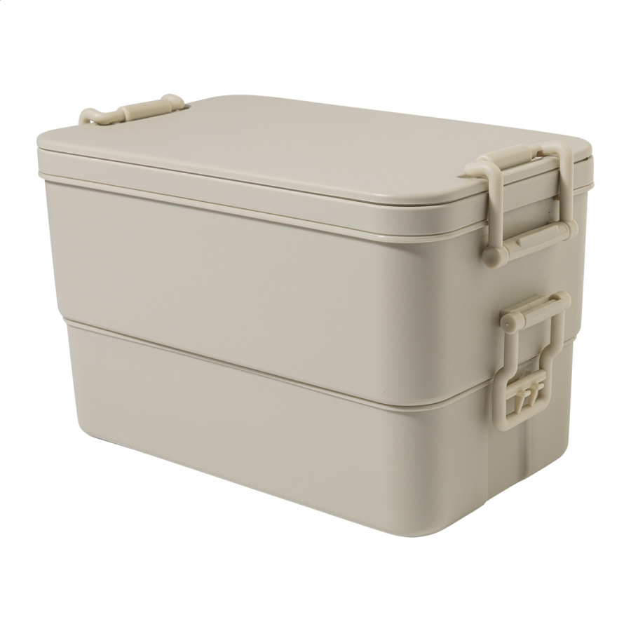 Box na jedlo z PP plastu so sadou príborov (vidlička, lyžica a nôž), zapínaním na pracku a 2 priehradkami (1000 ml a 800 ml). Stohovateľný design pre kompaktné skladovanie.