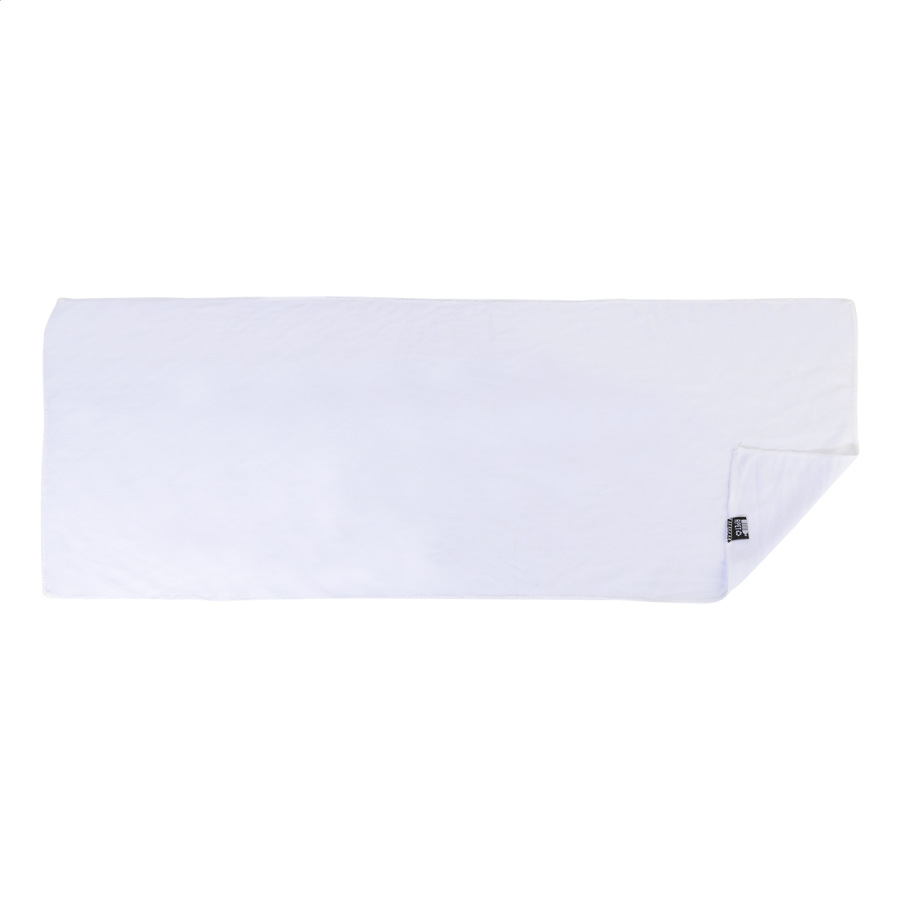 Chladiaci športový uterák z RPET polyesteru v RPET športovej fľaši s PP viečkom typu flip-top, integrovanou slamkou a prenosným popruhom. Objem 800 ml. Neobsahuje BPA. Nie je vhodná pre sýtené nápoje. Veľkosť uteráka: 30 × 80 cm.
