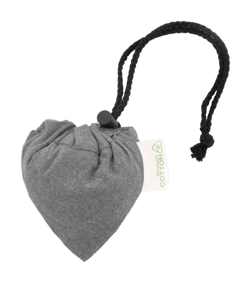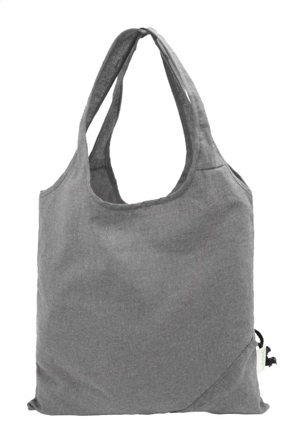Skladacia nákupná taška zo 70% recyklovanej bavlny a 30% polyesteru RPET, 140 g/m². S výrazným štítkom z recyklovanej bavlny.