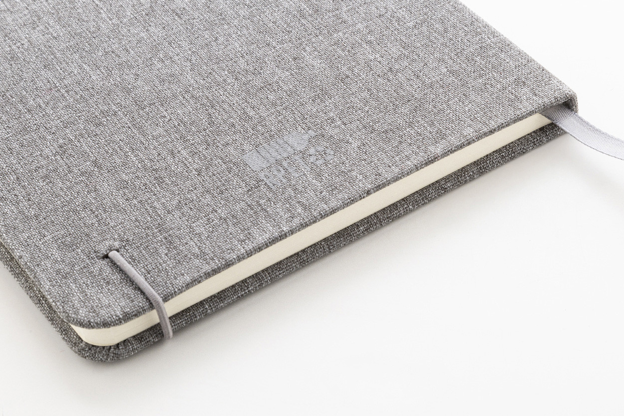 Blok A5 potiahnutý polyesterom 300D RPET s 80 čistými listami. S gumovým pásikom, záložkou a držiakom na pero.