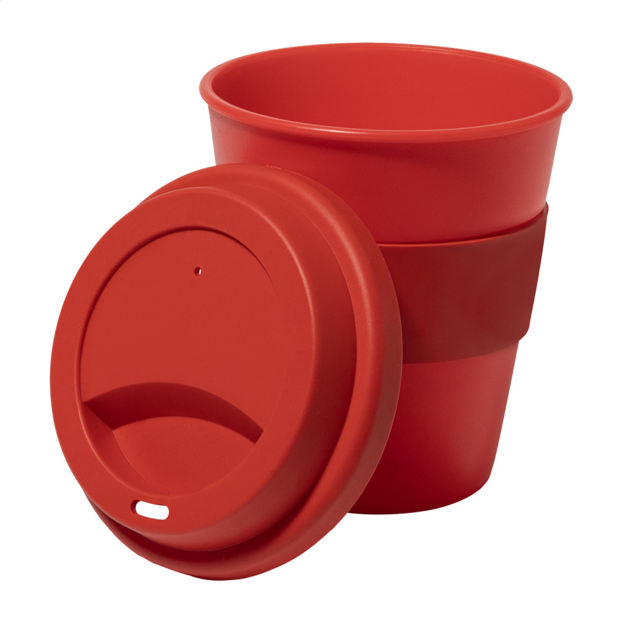 Jednostenný cestovný kelímok z plastu PP s viečkom z TPE a úchytom. 350 ml.