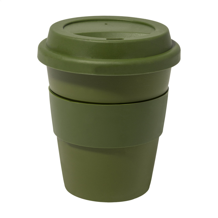 Jednostenný cestovný kelímok z plastu PP s viečkom z TPE a úchytom. 350 ml.