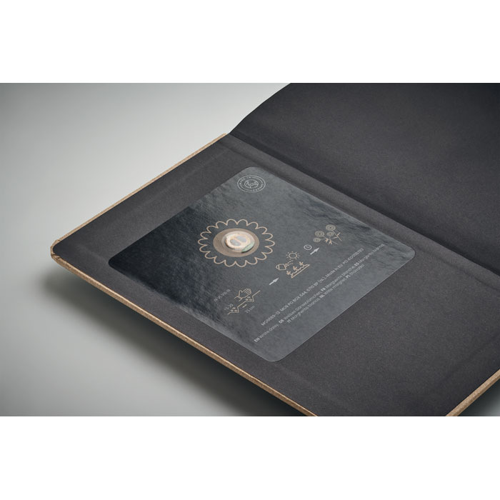 Zápisník A5 v tvrdých deskách. 184 stran (92 listů) linkovaného papíru, vyrobeného z recyklovaného papíru. Bavlněná záložka. Obsahuje semena k setí. Vyrobeno v EU. Tento udržitelný zápisník má nízký dopad na životní prostředí a je skvělým reklamním dárkem. Každá barva zápisníku obsahuje odlišná semínka, která můžete zasadit ve vaší zahradě. Každý typ má svoji barvu a vlastní kód: borůvka (04), jahoda (05), sedmikráska (13), borovice (60) a jablko (48).