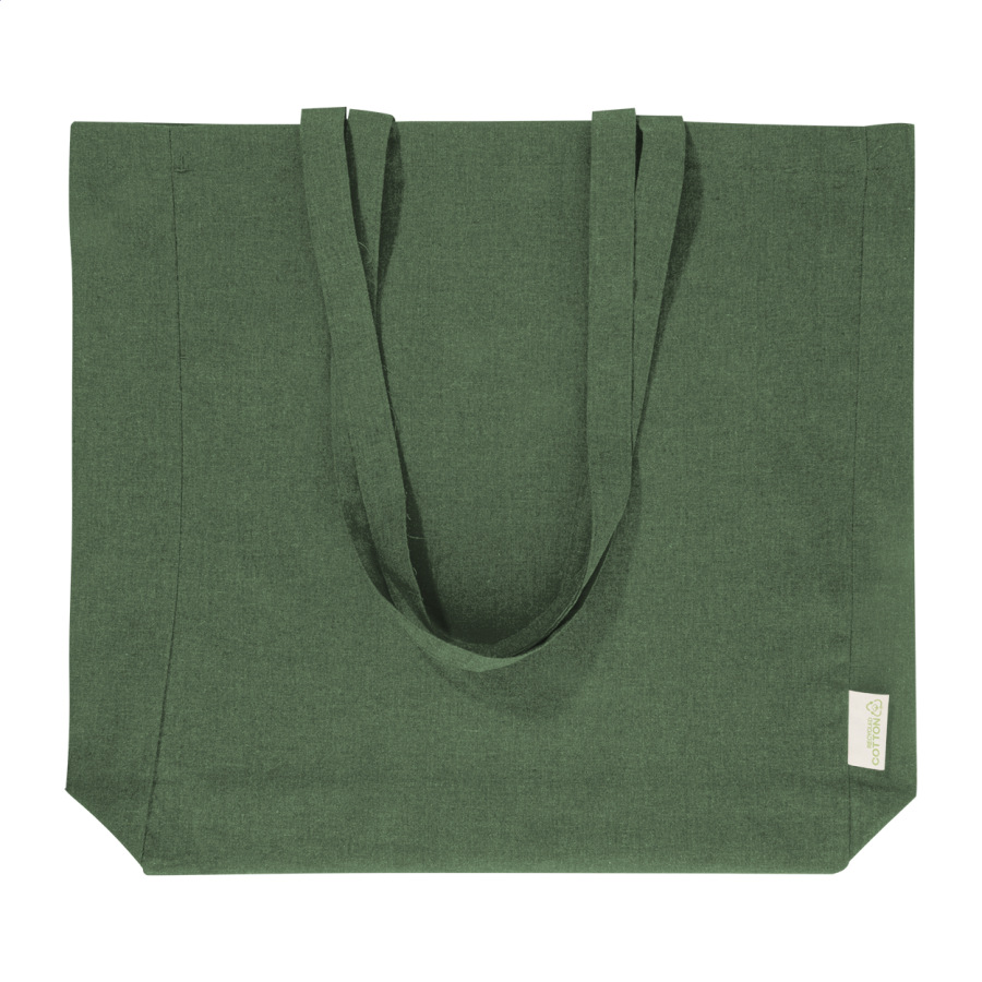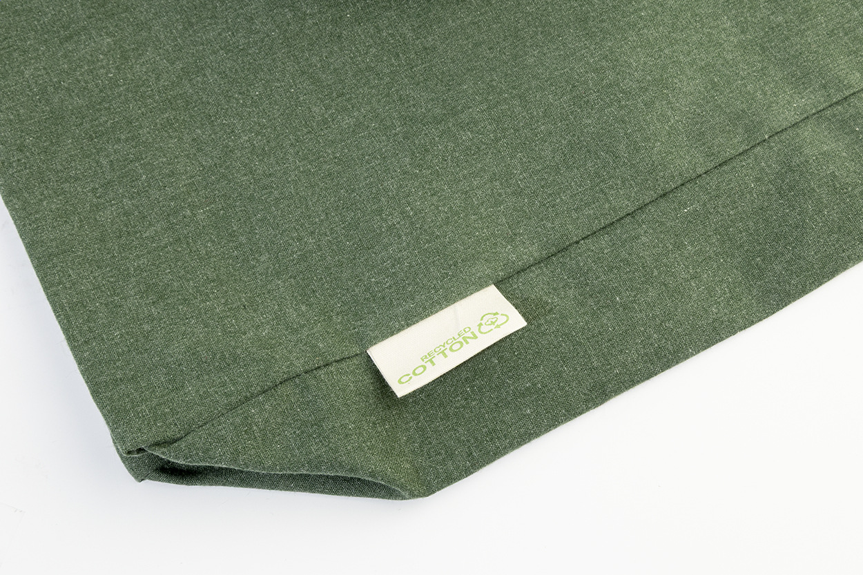 Nákupná taška s klinom a dlhými ušami zo 70% recyklovanej bavlny a 30% RPET polyesteru, 140 g/m². S výraznou etiketou o recyklovanej bavlne.